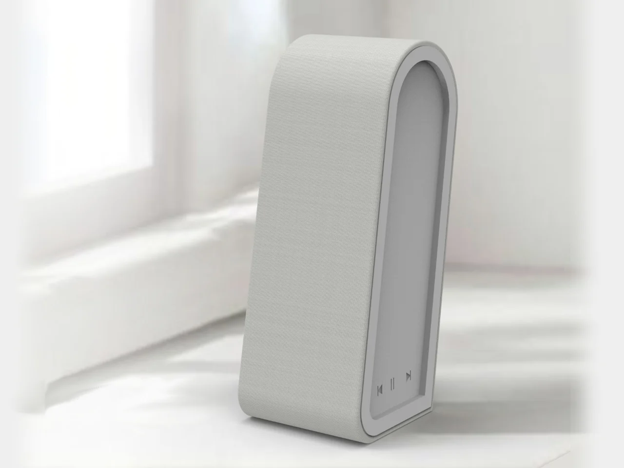 Колонка имеет вытянутый корпус с закруглённой верхней частью и небольшим наклоном назад. Фронтальная панель покрыта акустической тканью серого оттенка. В нижней части корпуса расположена панель управления с тремя кнопками: регулировка громкости и воспроизведение. Элементы управления встроены в поверхность и не выступают за пределы корпуса устройства.