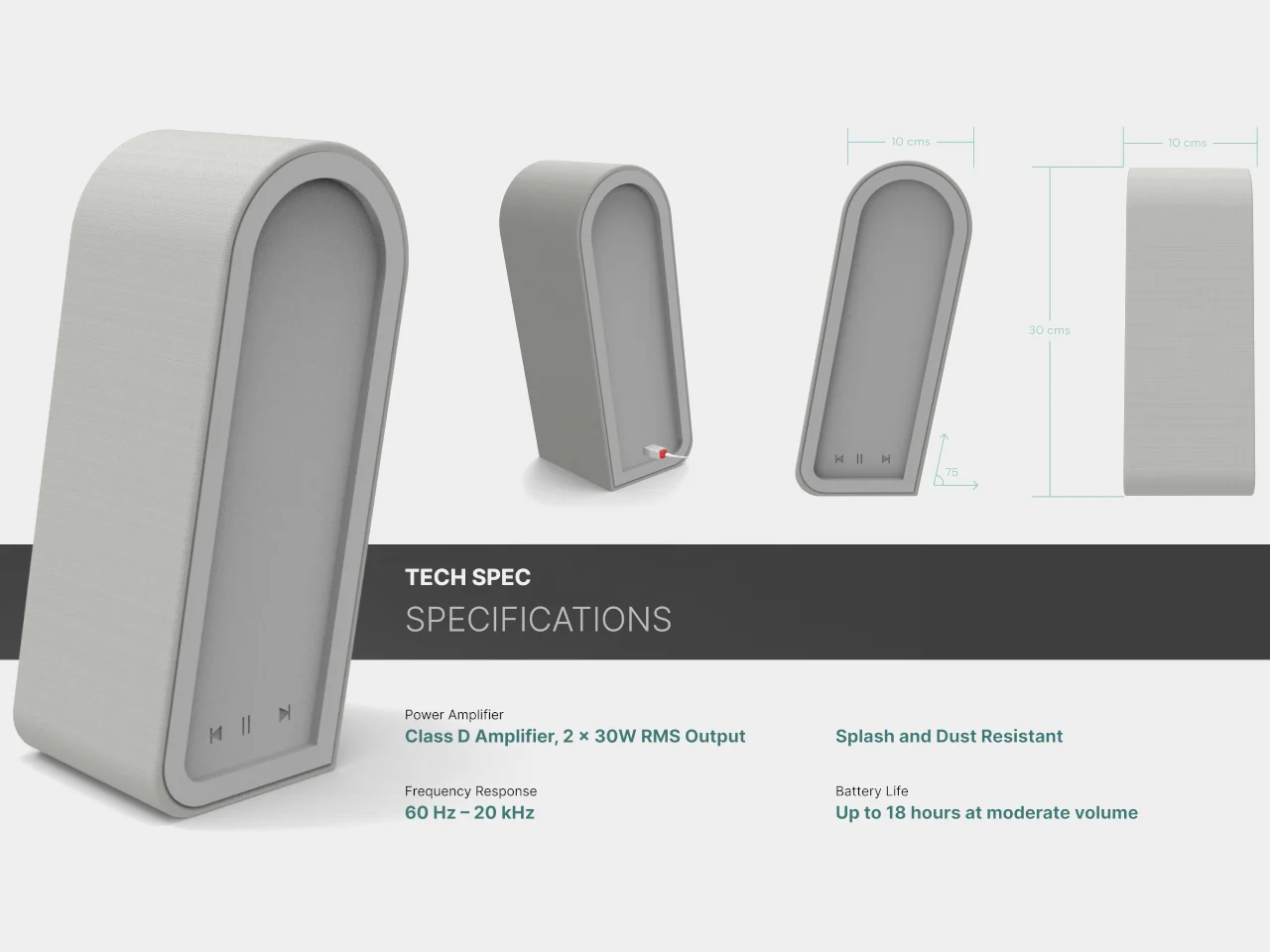 Вертикальная конструкция позволяет размещать колонку на книжных полках, письменных столах и комодах. Высота корпуса обеспечивает приподнятое расположение динамиков относительно поверхности установки. Питание осуществляется от встроенного аккумулятора, что исключает необходимость постоянного подключения к электросети.