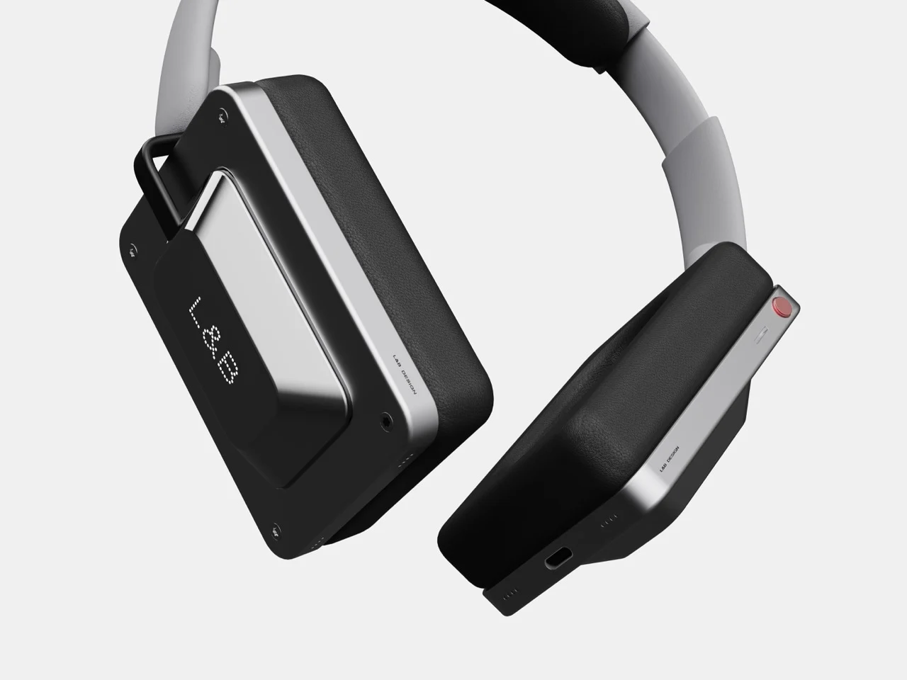 Конструкция наушников включает в себя телескопическое регулируемое оголовье и разъём USB-C для зарядки, расположенный в нижней части устройства. На корпусе чашек видны винты со скрытой головкой, что соответствует индустриальному стилю оформления. Кнопка питания находится в верхней части правого наушника.