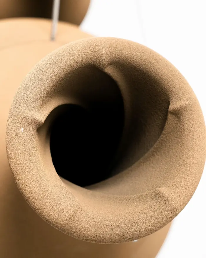 Выбор кварцевого песка в качестве основного материала для корпуса обусловлен его акустическими свойствами. Плотная и пористая структура материала эффективно поглощает микровибрации, возникающие при работе динамиков. Это инженерное решение направлено на снижение искажений звука, которые могут быть вызваны резонансом самого корпуса. Внешне корпус имеет матовую шероховатую фактуру и нейтральный песочный цвет.