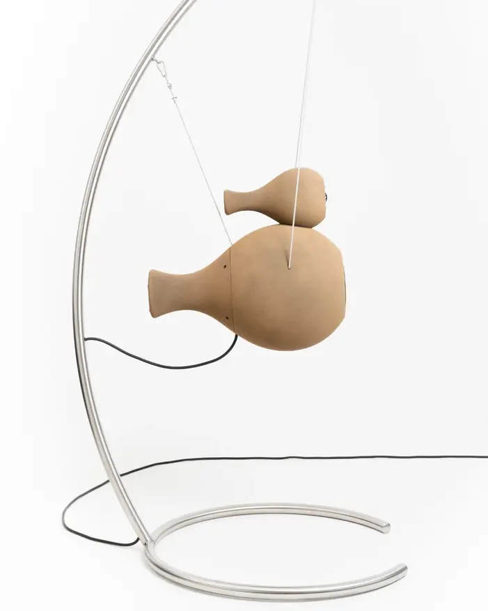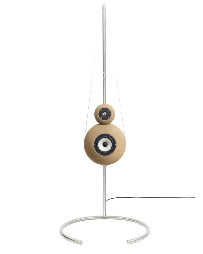 Ещё одним конструктивным элементом является система подвеса. Динамики не устанавливаются на пол или другую поверхность, а подвешиваются в воздухе на стальных тросах. Тросы крепятся к металлической изогнутой стойке. Такое решение физически изолирует акустическую систему от внешних вибраций, передающихся через поверхности, что дополнительно повышает чистоту звучания.