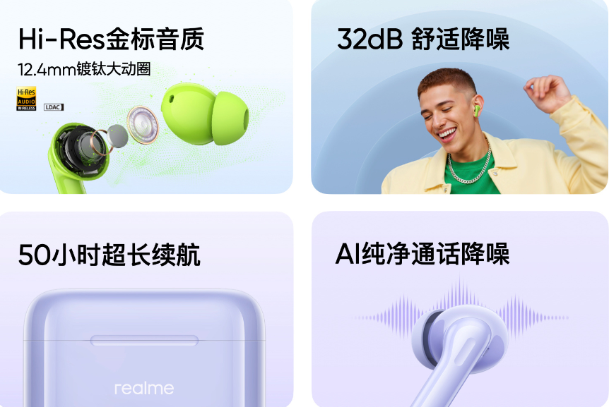 Одной из особенностей Realme Buds T200 стала заявленная продолжительность работы до 50 часов от одного заряда. Для звука предусмотрены 12,4-миллиметровые динамики с титановым покрытием. Также устройство поддерживает аудиокодек LDAC, а качество звука соответствует стандарту Hi-Res Gold Label.