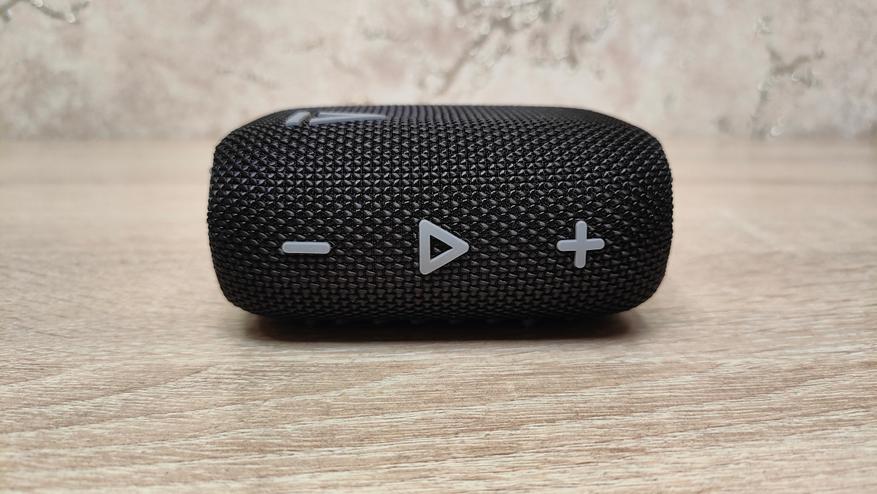 Симпатичная колонка с простым, но стильным дизайном, которая своим логотипом сразу даёт понять чья она. Вся она закатана в ткань сеткой, создаётся впечатление, что это большой динамик с кнопками. Кнопок здесь столько же, сколько у недавней Creative Movo Free, то есть четыре. Каких-либо разъёмов и слотов здесь нет, ну, естественно кроме зарядки. На одном торце расположен пассивный излучатель, наверное, предполагается, что колонку можно поставить.