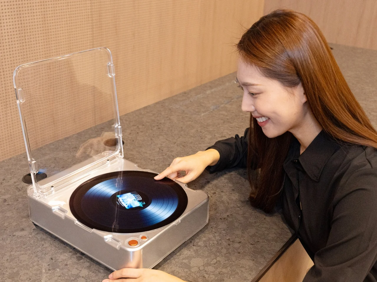 Второй концепт представляет собой устройство с круглым OLED-экраном диагональю 13,4 дюйма, стилизованное под виниловый проигрыватель. Дисплей способен транслировать изображения и видеоролики во время воспроизведения музыки, создавая визуальное сопровождение аудиоконтента.