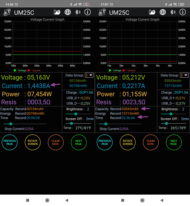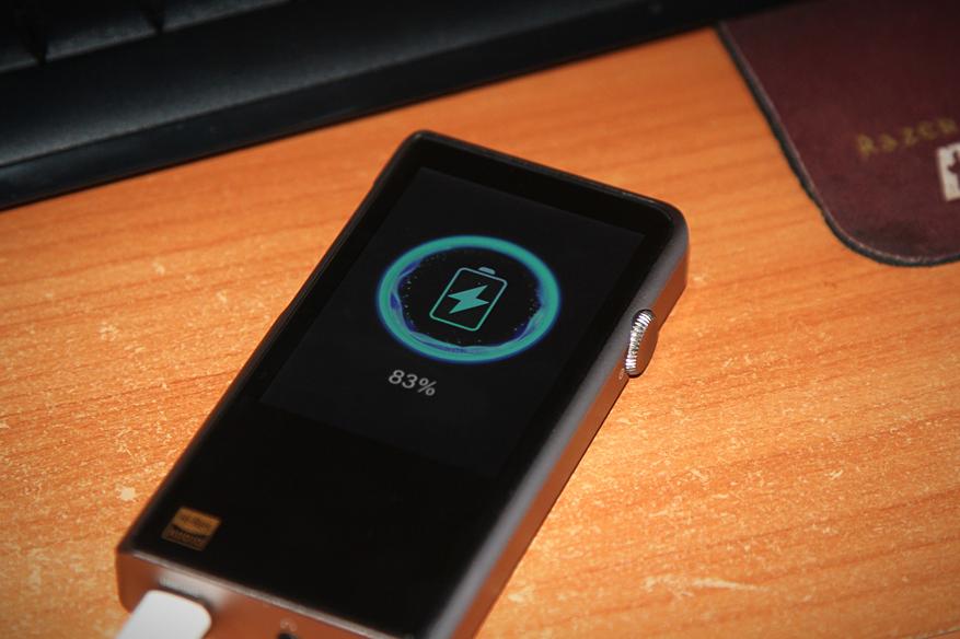 Заявленная ёмкость аккумулятора: 3400 мАч. Батареи хватает в среднем на 15 часов воспроизведения (3.5 мм), и около 9-10 часов при балансном подключении через разъём 2.5 миллиметра. Я тестировал плеер с низкоомными динамическими наушниками, на громкости 60% с включенным усилением аккумулятор продержался 15 часов 20 минут (3.5 мм). Воспроизводил по кругу один и тот же альбом в формате FLAC. Ток заряда 1.5A, заряжается Shanling M5S 2 часа 40 минут. Что касается залитой ёмкости, у меня вышло 3043 mAh при 5 вольтах, тогда как производитель указал ёмкость при 3.7V. Так что всё нормально.