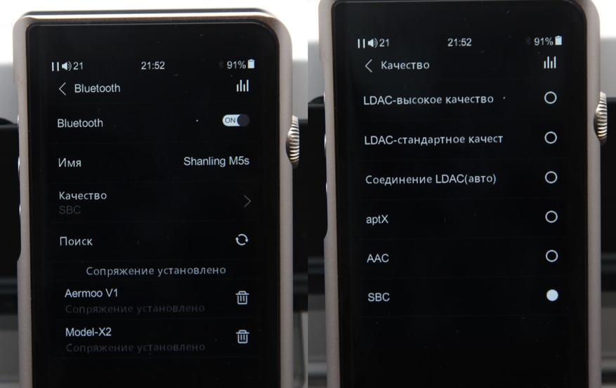 Bluetooth чип Qualcomm версии 4.2. M5S умеет принимать и отдавать сигнал по воздуху. Что касается приёма сигнала, тут я снова в качестве источника использовал X2 Cube. Предварительно поковырялся в настройках, так как при выбранном кодеке «LDAC» приставка плеер не увидела. А если быть точнее — увидела, но не смогла установить связь.