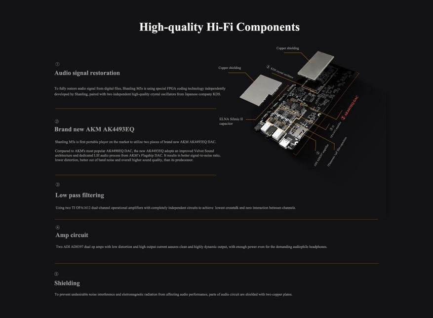 Shanling M5S имеет акцент на НЧ и ВЧ, но звучание в целом можно охарактеризовать как темное. Звук меня приятно удивил, переключаясь со своего настольного комбайна (Burson Audio Playmate) на плеер — я не заметил больших отличий. Основные отличия наблюдаются на высоких частотах. У сабжа ВЧ слегка размыты, попроще атаки и затухания. Настольный ЦАП даёт больше объёма и воздуха на ВЧ. Если брать за сравнение дешевый «Activo CT10» — тут уже M5S на голову выше. Слышна каждая тарелочка, щёточка, детализация ну просто отличная. Что касается совместимости, вот здесь я бы посоветовал избегать дешевых гибридных моделей с ярко выраженными высокими частотами, так как плеер немного акцентирует данную часть диапазона.