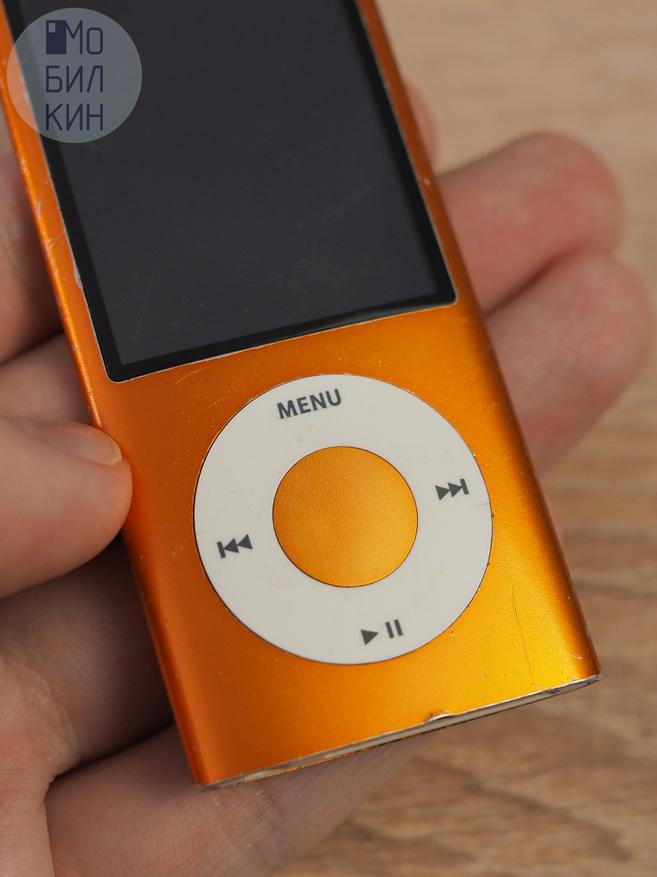 Под дисплеем находятся пять кнопок, четыре из которых встроены в сенсорное колесо прокрутки. Логика управления нестандартная, но к ней быстро привыкаешь: боковые кнопки отвечают за переключение треков, нижняя — за паузу, верхняя возвращает нас назад, а центральная работает как клавиша «ОК», вызывает при удержании контекстное меню, а также перенастраивает сенсорную панель в интерфейсе плеера — смена громкости, перемотка трека, выставление оценки и выбор режима перемешивания. Пятый Nano стал одним из последних Айподов с классическим дизайном: следующие «малыши» уже имели сенсорный экран и соответствующий ему интерфейс.
