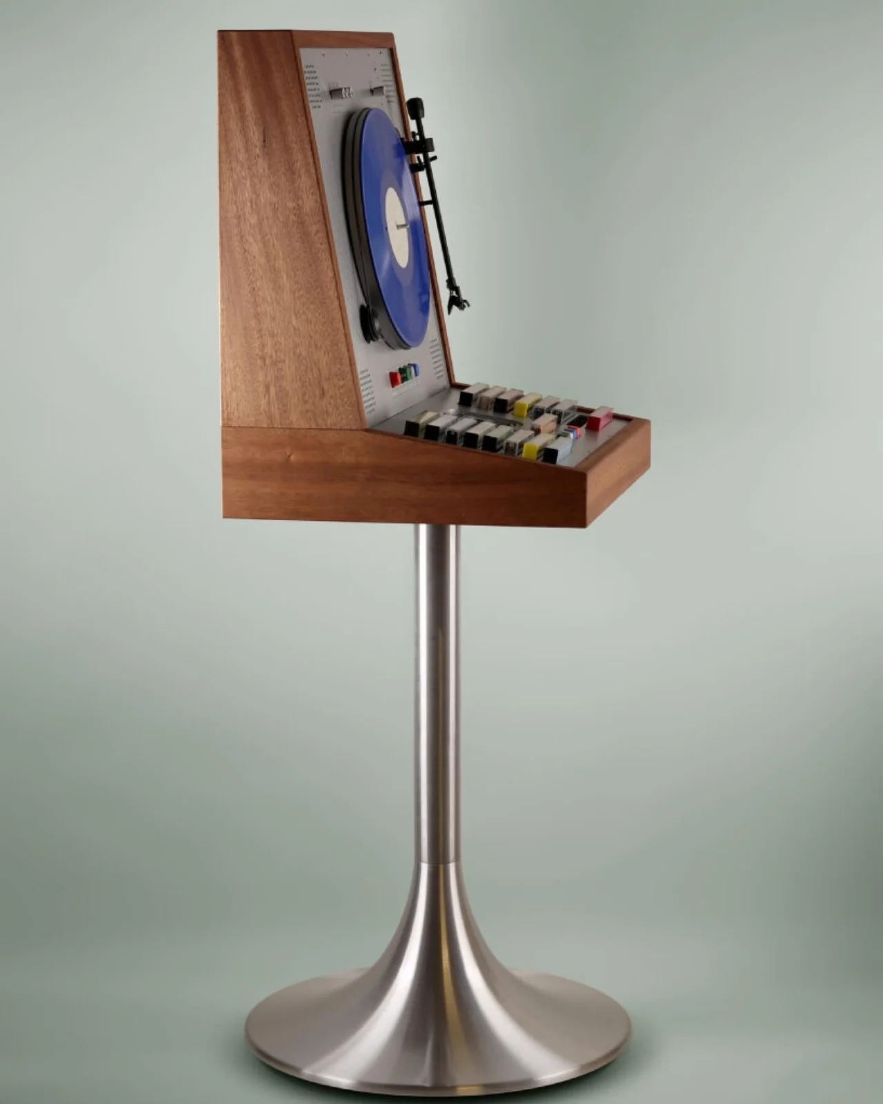 Конструктивной особенностью шкафа является вертикальное расположение проигрывателя: виниловая пластинка вращается в вертикальной плоскости. Корпус изготовлен из натурального дерева, тогда как передняя панель вокруг проигрывателя выполнена из светло-серого металла. В верхней части панели расположен ряд круглых регуляторов для раздельной настройки высоких, средних и низких частот. По обеим сторонам от регуляторов размещены решётки встроенных динамиков.