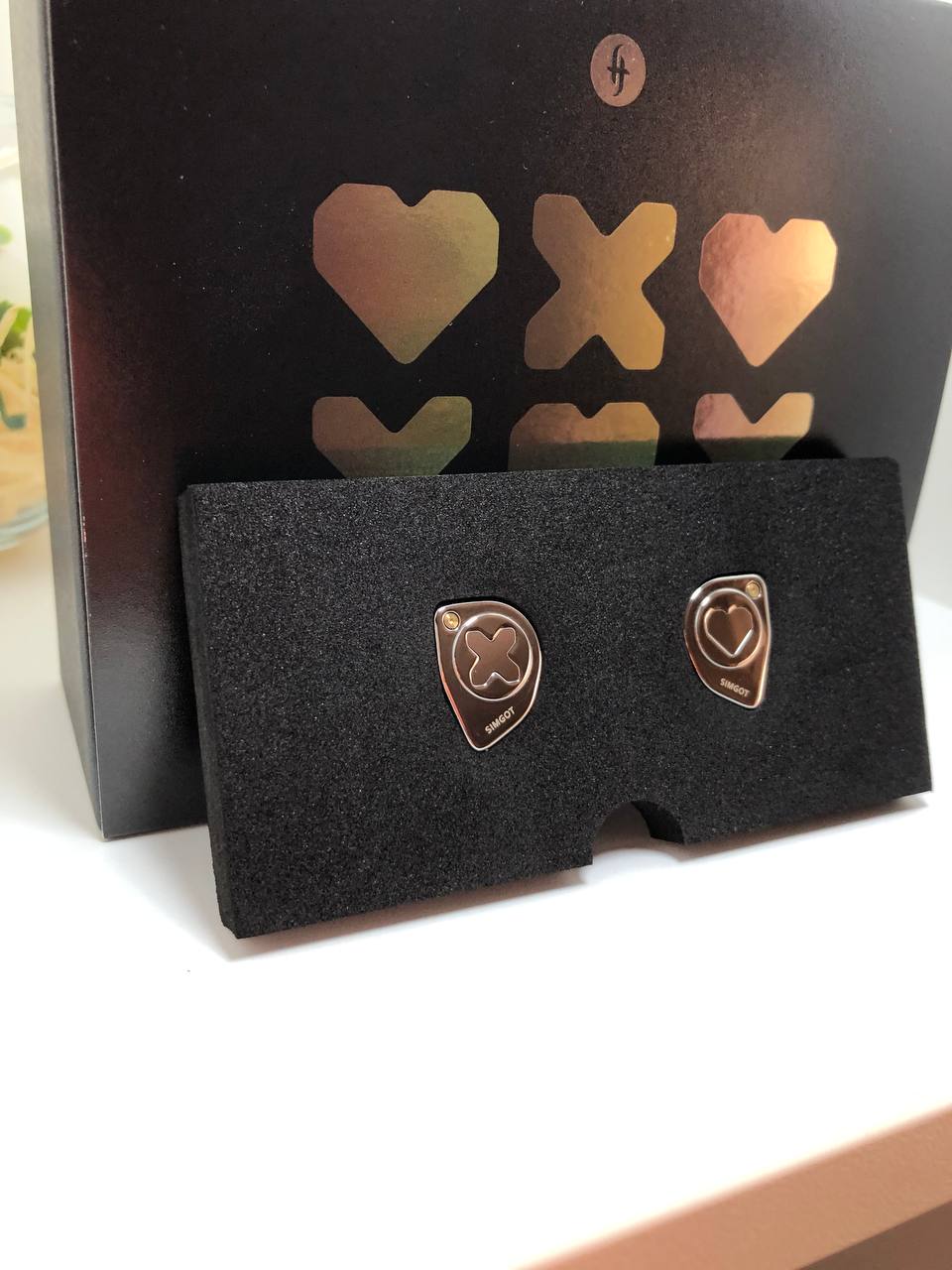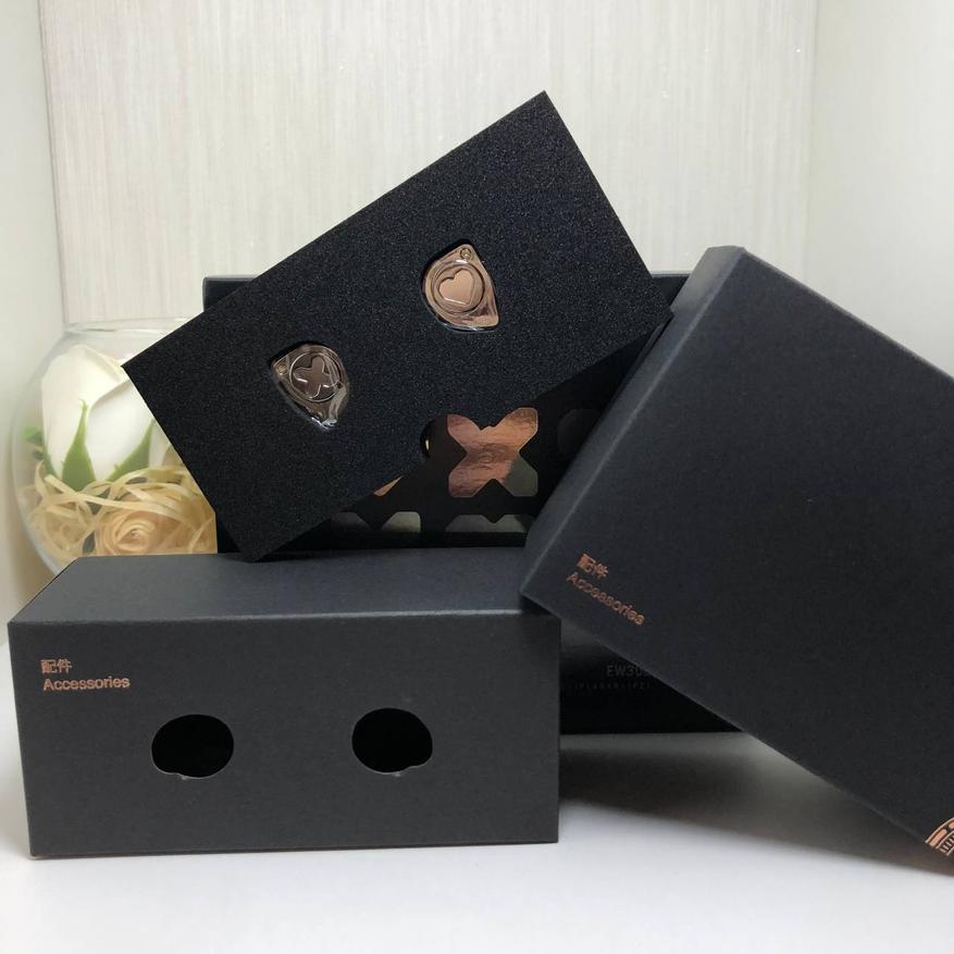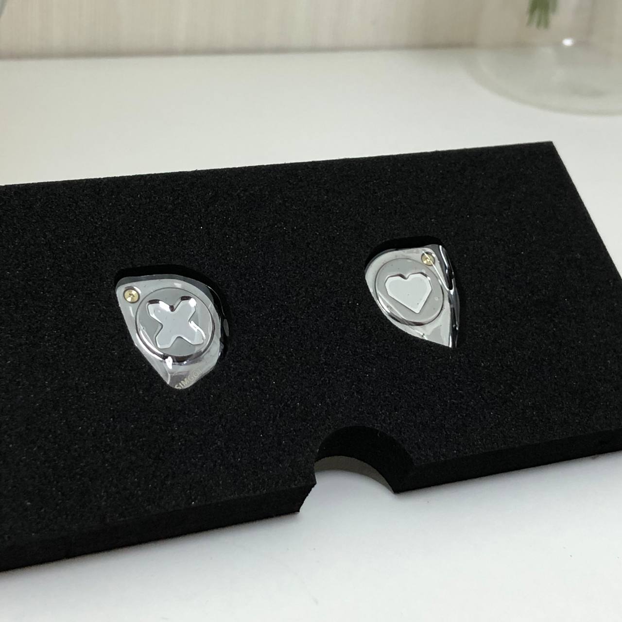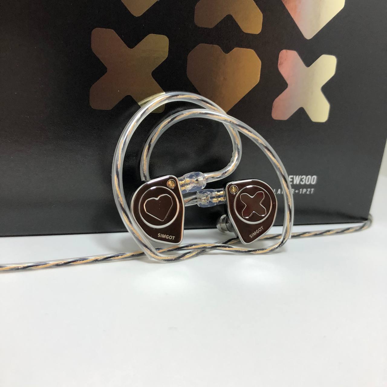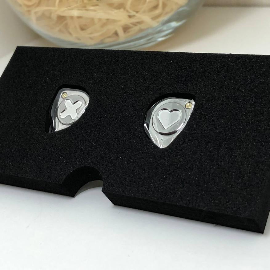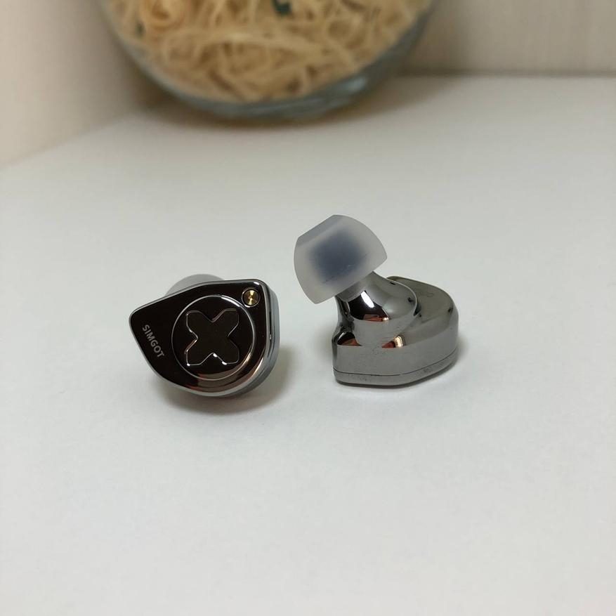 Simgot EW300 сделаны из метала, соединенных из 2ух частей. На лицевой части нанесена тематические логотипы данного продукта. Левый шел украшает логотип «X» обведенный в круг, а на правом шеле рассположилось красивое сердце. Так же на передней части есть красивое дополнение в виде латунного болта и гравировка «Simgot»