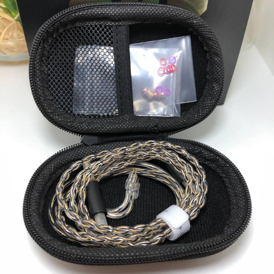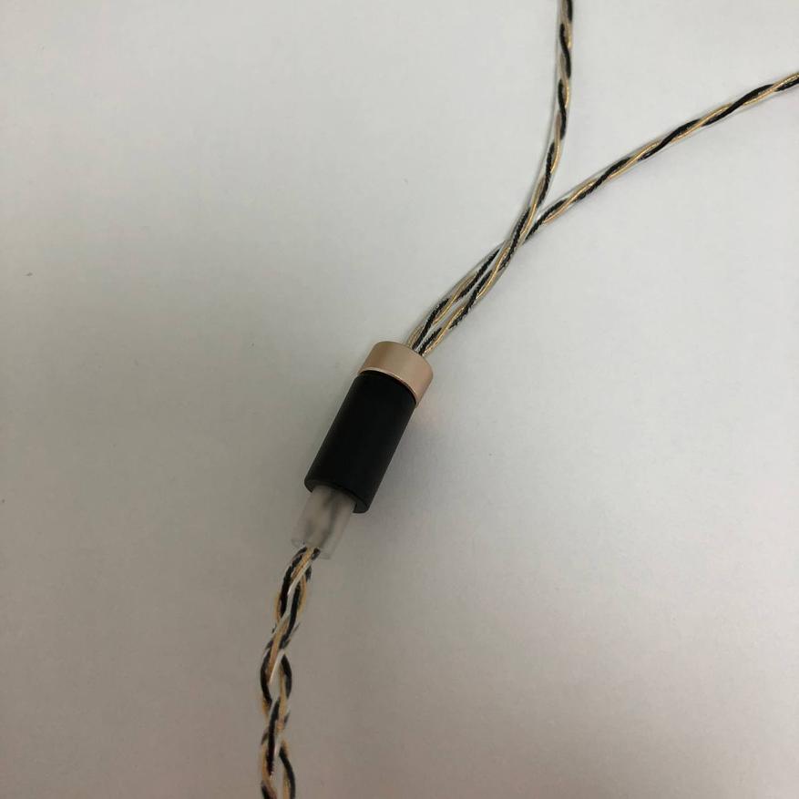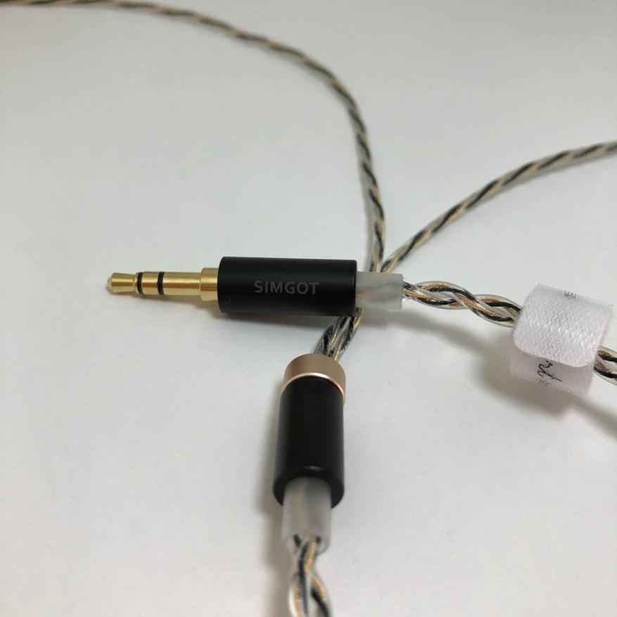 На одном конце кабеля находится 3.5mm jack с золотым напылением и брендом «Simgot», по середине приятный сплитер и металическое позолоченное кольцо, а на другом конце агрессивной формы ушные крючки с индикацией правого/левого канала и 0.78 2pin коннектор. Кабель покрыт ПВХ материалом защищающим от перегибов и любых повреждений