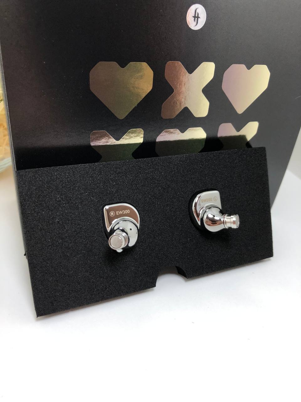 На задней части расположился съемный звуковод, который вы можете заменить на комплектный, без демпфирующей пены внутри. На конце звуковода расположен бортик, а внутри металическая сеточка. Так же там нанесена гравировка модели наушников «EW300», индикаторы R/L и небольшое компенсационное отверстие