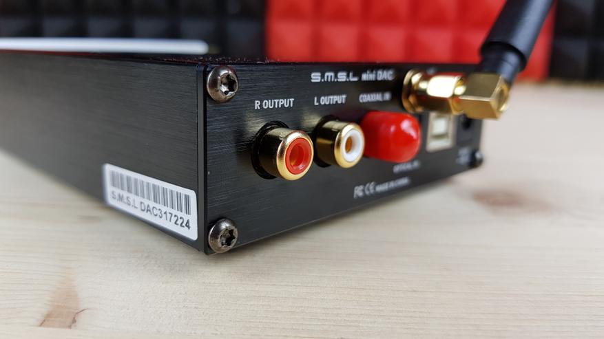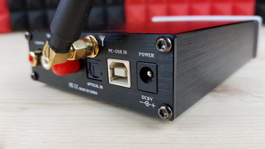 Сзади находится единственный выход на RCA разъемы (для подключения усилителя или какой-нибудь активной акустики), коаксиальный и оптический входы, USB, питание и, естественно, блютуз антенна. Кстати, именно наличие блютуз отличает B-версию от обычной.