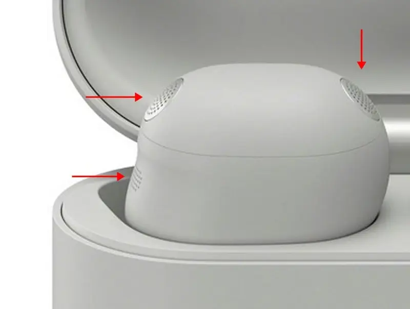 Конструкция корпуса каждого наушника предусматривает три внешних отверстия для микрофонов. Такое расположение указывает на наличие системы активного шумоподавления с несколькими внешними микрофонами и дополнительным внутренним микрофоном обратной связи, расположенным внутри ушного канала.