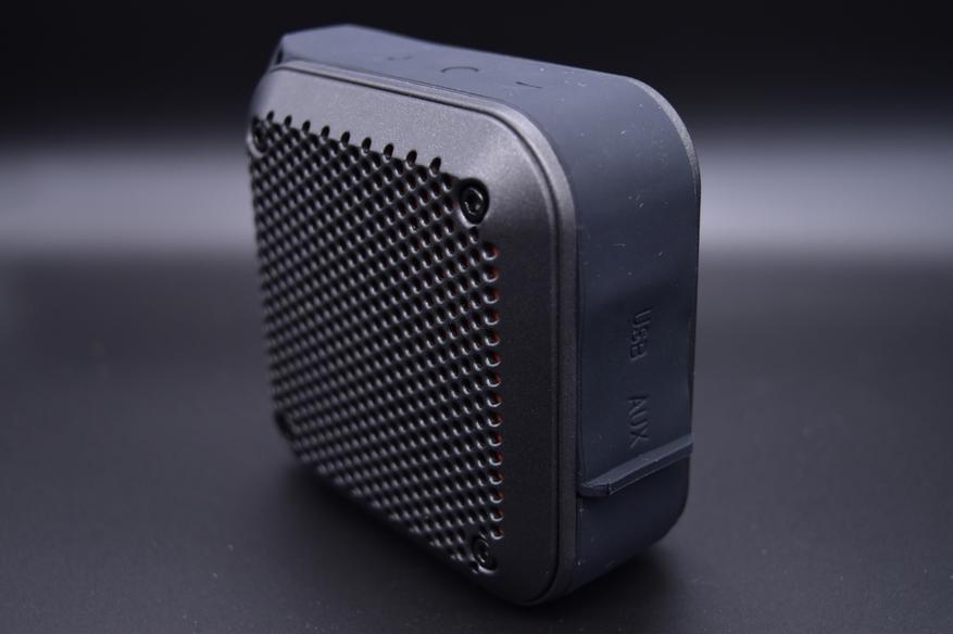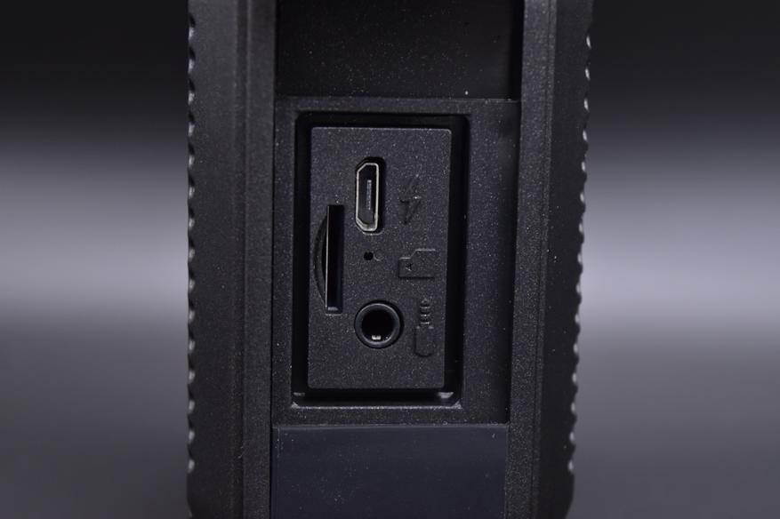 На левом торце находится плотная заглушка с надписью USB, AUX. Под заглушкой расположены AUX разъем для проводного подключения к источнику сигнала, слот для подключения карт памяти micro SD, разъем microUSB для подключения АС к зарядному устройству либо к порту USB персонального компьютера.