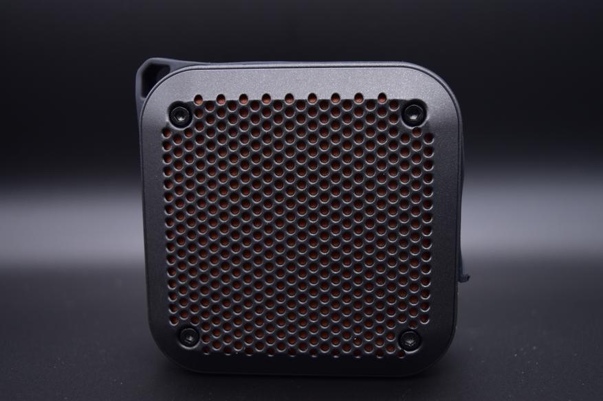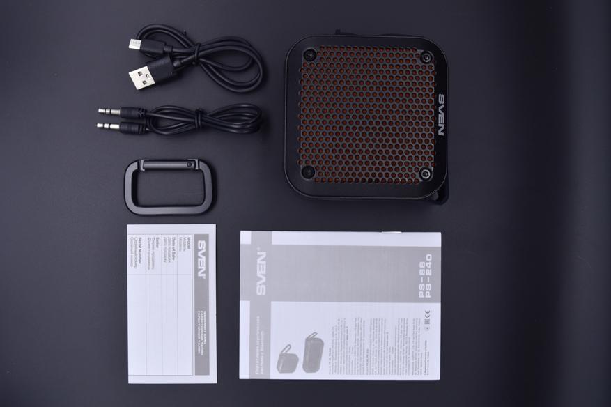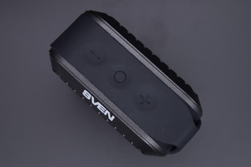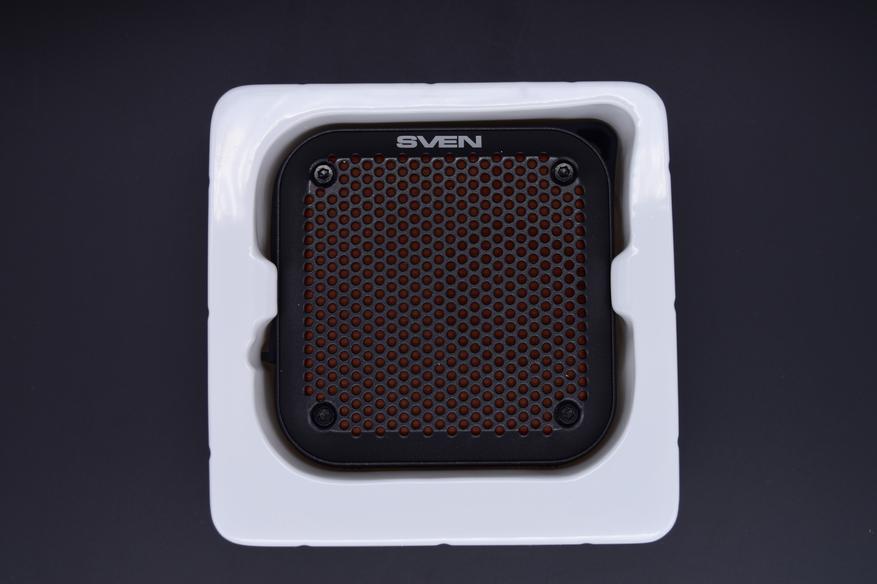 На передней поверхности расположен логотип компании «SVEN», чуть ниже стилизованная пластиковая решетка, за которой расположен 36 миллиметровый динамик. Крепление решетки к корпусу устройства осуществляется при помощи четырех винтов под шестигранник. Под решеткой расположен светодиодный индикатор состояния устройства. В верхнем правом углу расположен специальный элемент, для крепления комплектного карабина.