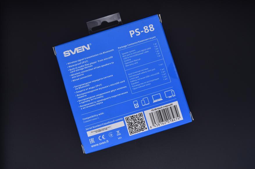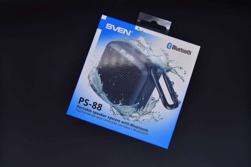 Поставляется SVEN PS-88 в картонной коробке, выполненной в фирменной цветовой гамме компании Sven. На передней поверхности коробки находится изображение устройства, на котором производитель акцентирует внимание на том, что колонка имеет защиту от попадания влаги.
