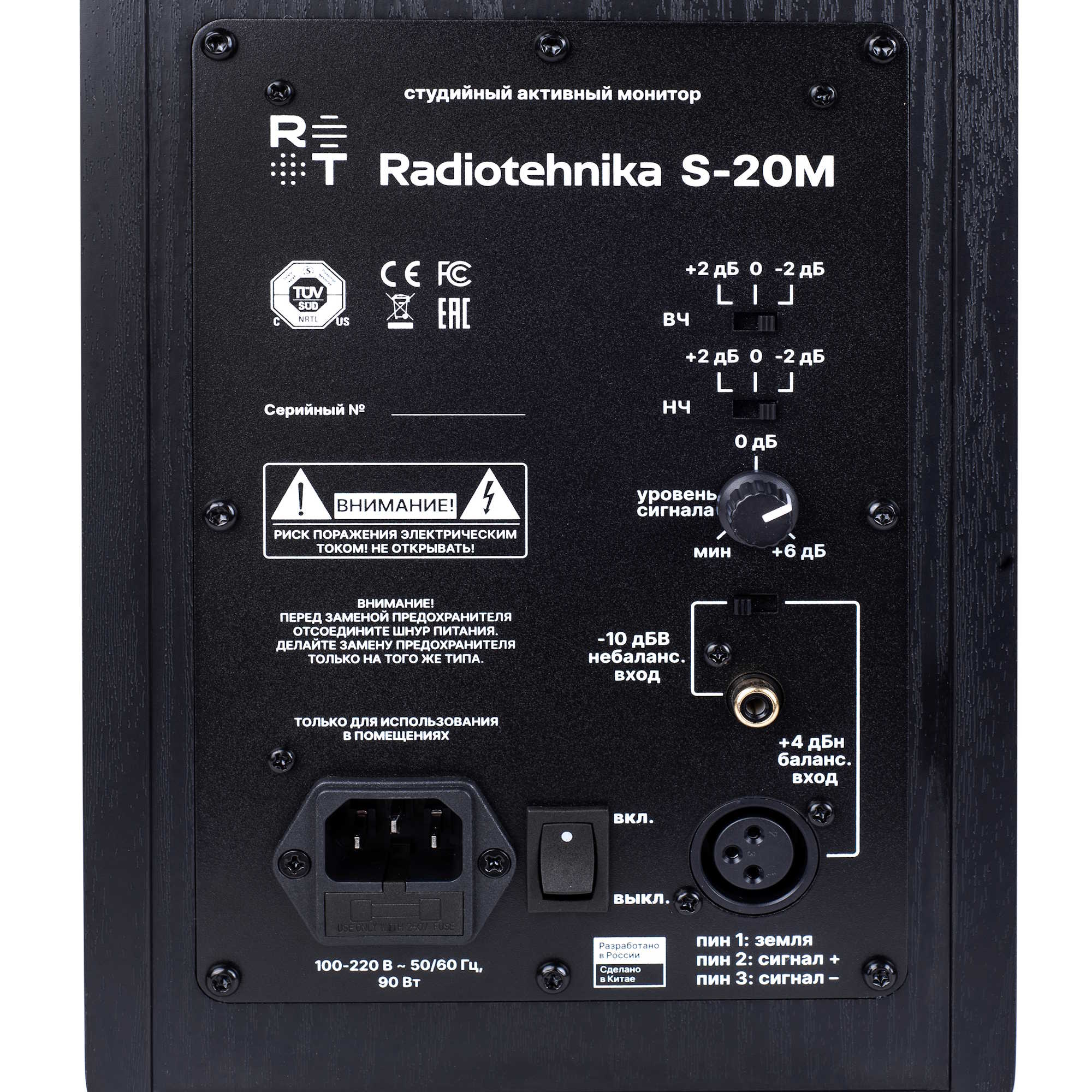 Компания Radiotehnika расширяет ассортимент своей аудио продукции и на основе двухполосной акустики S-20 выпускает студийные активные мониторы ближнего поля S-20M. Набор динамических излучателей такой же (дюймовый шелковый купольный ВЧ динамик и 5-дюймовый СЧ/НЧ с диифузором из композита, поделенные на 2,3 кГц), но добавился поканальный усилитель мощности класса D на 20+50 Вт RMS (ВЧ+НЧ) и возможность работы с интерфейсом XLR. Максимальное звуковое давление развивается до 108 дБ, мониторы подходят для студий до 20 м².