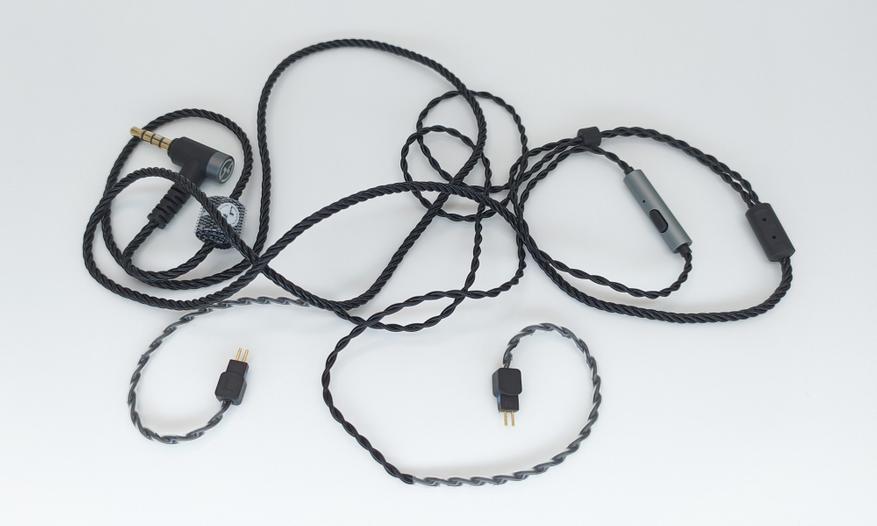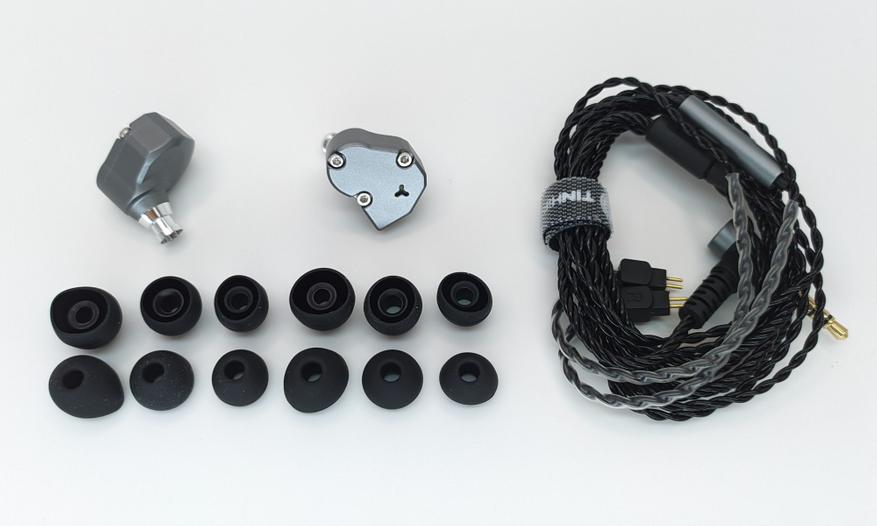В комплект нам положили два набора совершенно одинаковых насадок, кабель, сами наушники и скрутку для кабеля.