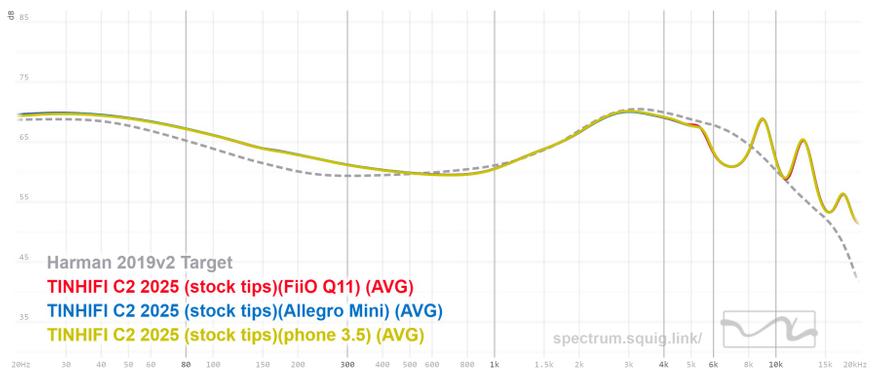 При выборе С2 2025 стоит иметь в виду, что это музыкальные наушники, не претендующие на аудиофильское звание, но зато очень хорошо умеющие в музыкальность, поэтому и ЦАП к ним совершенно не обязателен, и звучат они одинаково хорошо как с ЦАПом, так и просто с телефоном. Ниже график сравнения с ЦАПами FiiO Q11, Kiwi Ears Allegro Mini и 3,5 разъема телефона на Android.