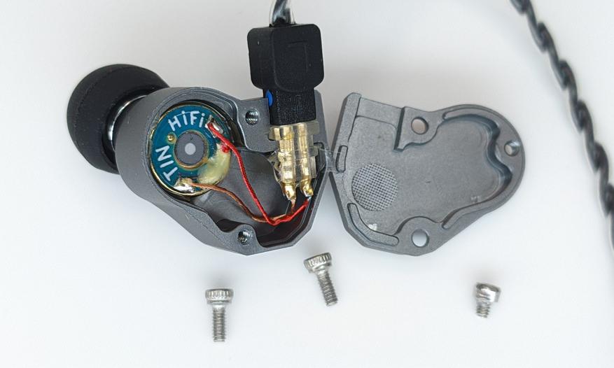 На фейсплейтах три болтика, которые не декоративные, а самые что ни на есть настоящие. Открутив их и подцепив крышку лезвием канцелярского ножа, можно заглянуть внутрь. Такие корпуса — это просто находка для тех, кто занимается кастомизацией наушников. На «Али» есть много доступных динамических драйверов и даже, по слухам, есть драйвера от Tanchjim Oxygen за вполне гуманный прайс.