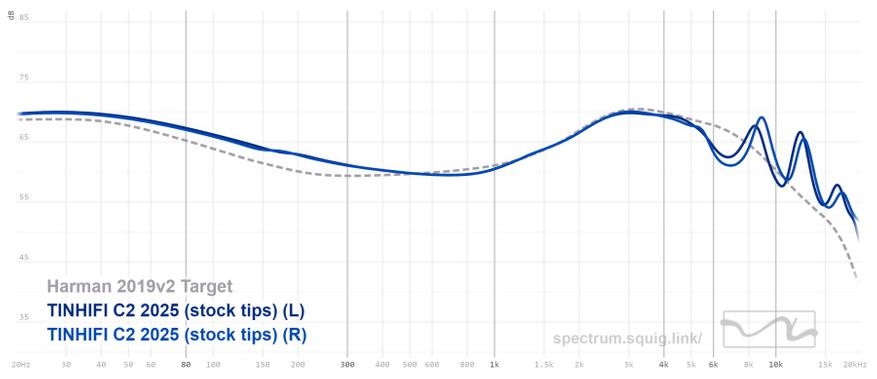 Кривая АЧХ С2 практически повторяет кривую Harman Target 2019, а это значит, что в целом наушники претендуют на универсальное звучание. Есть небольшое усиление верхнего баса и нижних средних частот, но это идет наушникам только на пользу — ударность бочек и брутальность мужских голосов с такой настройкой гарантированы.