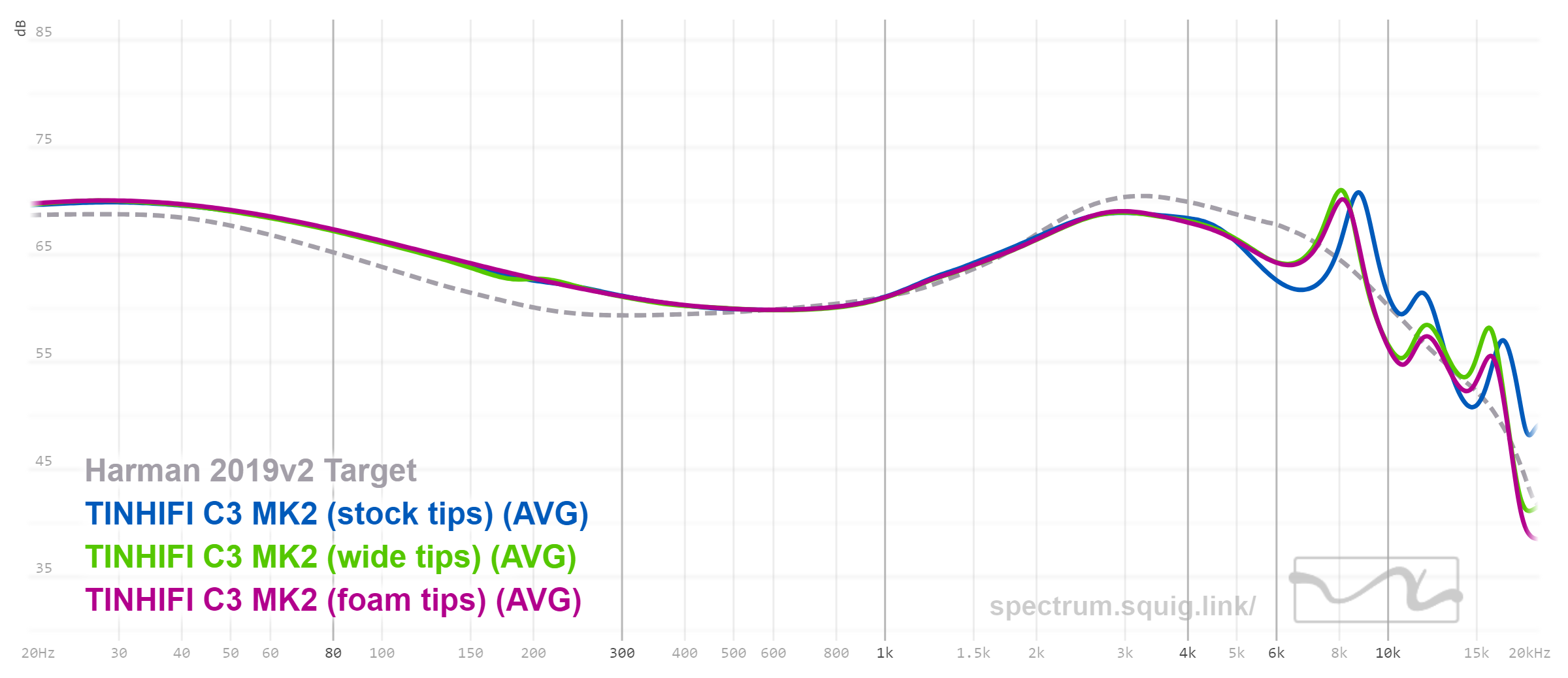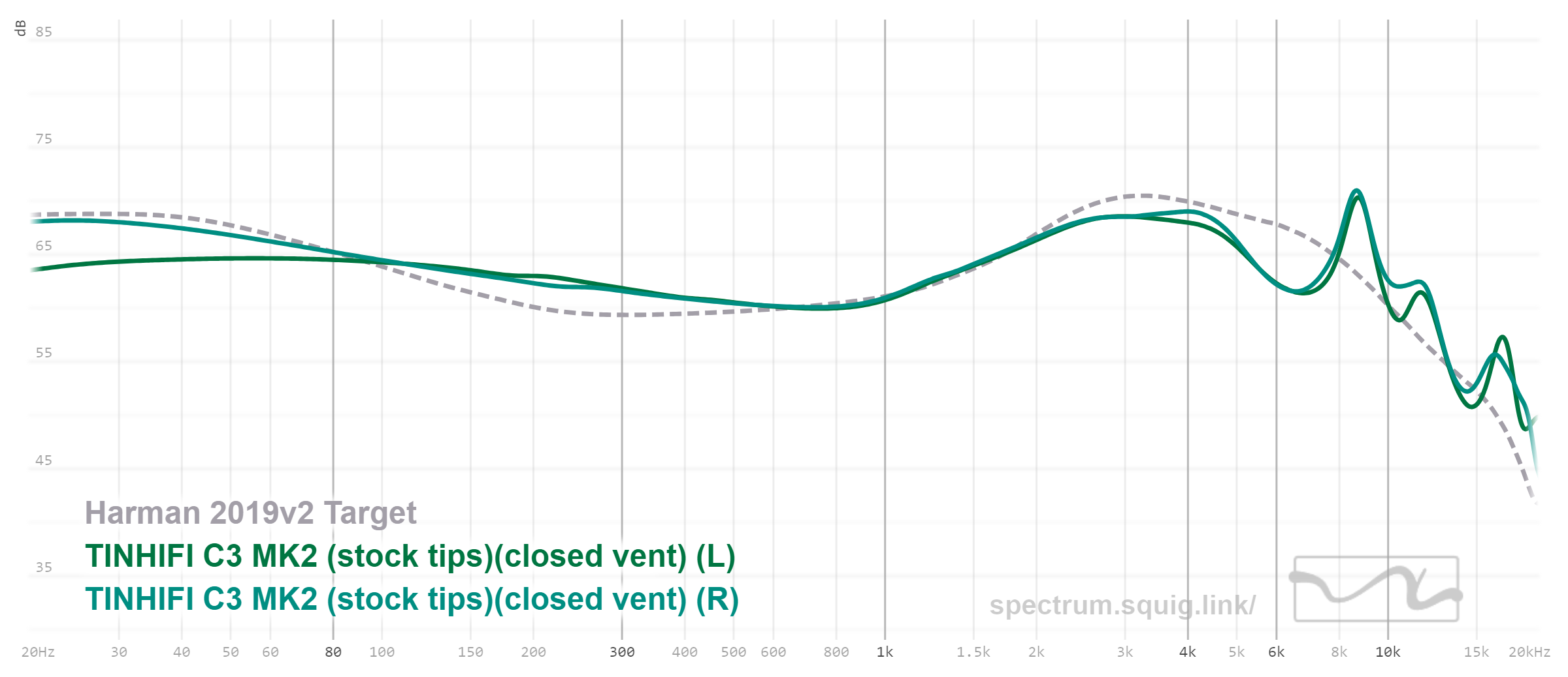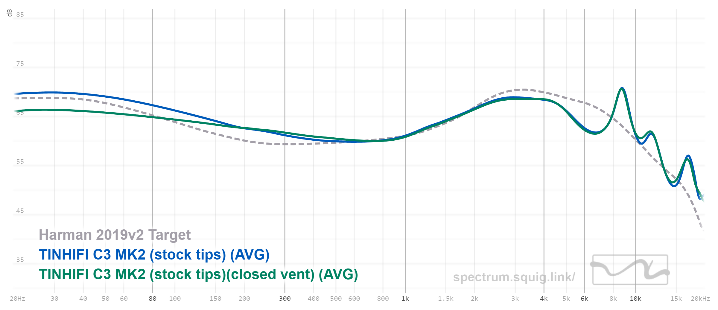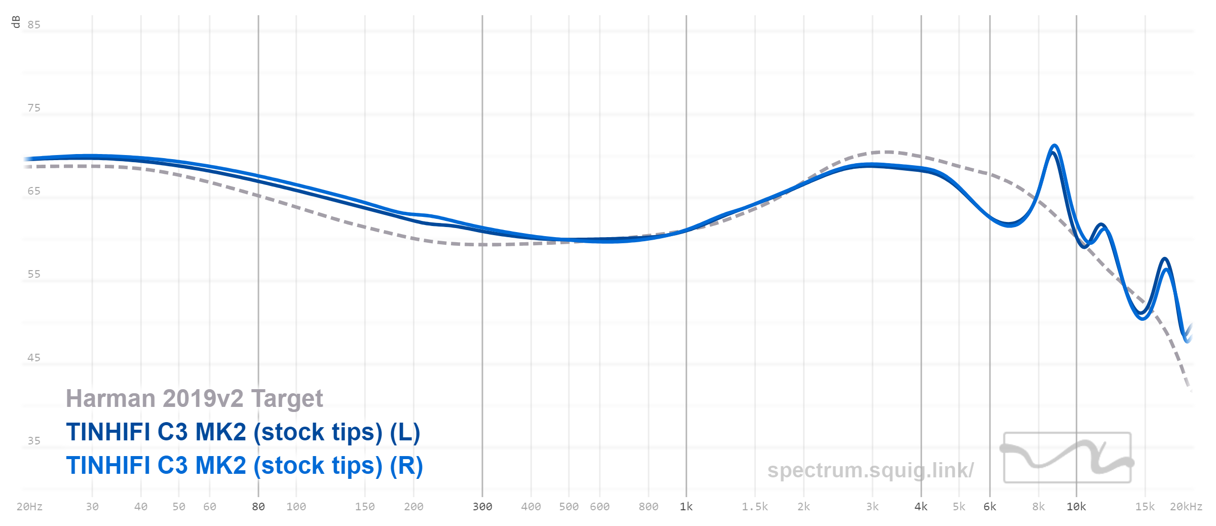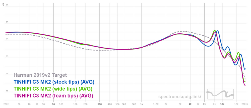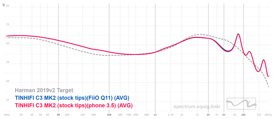 Профиль звучания C3 MK2 можно назвать классической V-шкой с довольно распространенной настройкой, которая включает в себя хорошо приподнятый бас, приподнятую верхнюю середину, а также очень популярный у китайских производителей добавочный пик детализации для придания яркости и акцента атакам. В общем, график C3 MK2 практически точно попадает в кривую Harman Target 209 для внутриканальных наушников, которую вывели экспериментально и которая соответствует усредненному предпочтению различных меломанов и людей, имеющих непосредственное отношение к звуку.