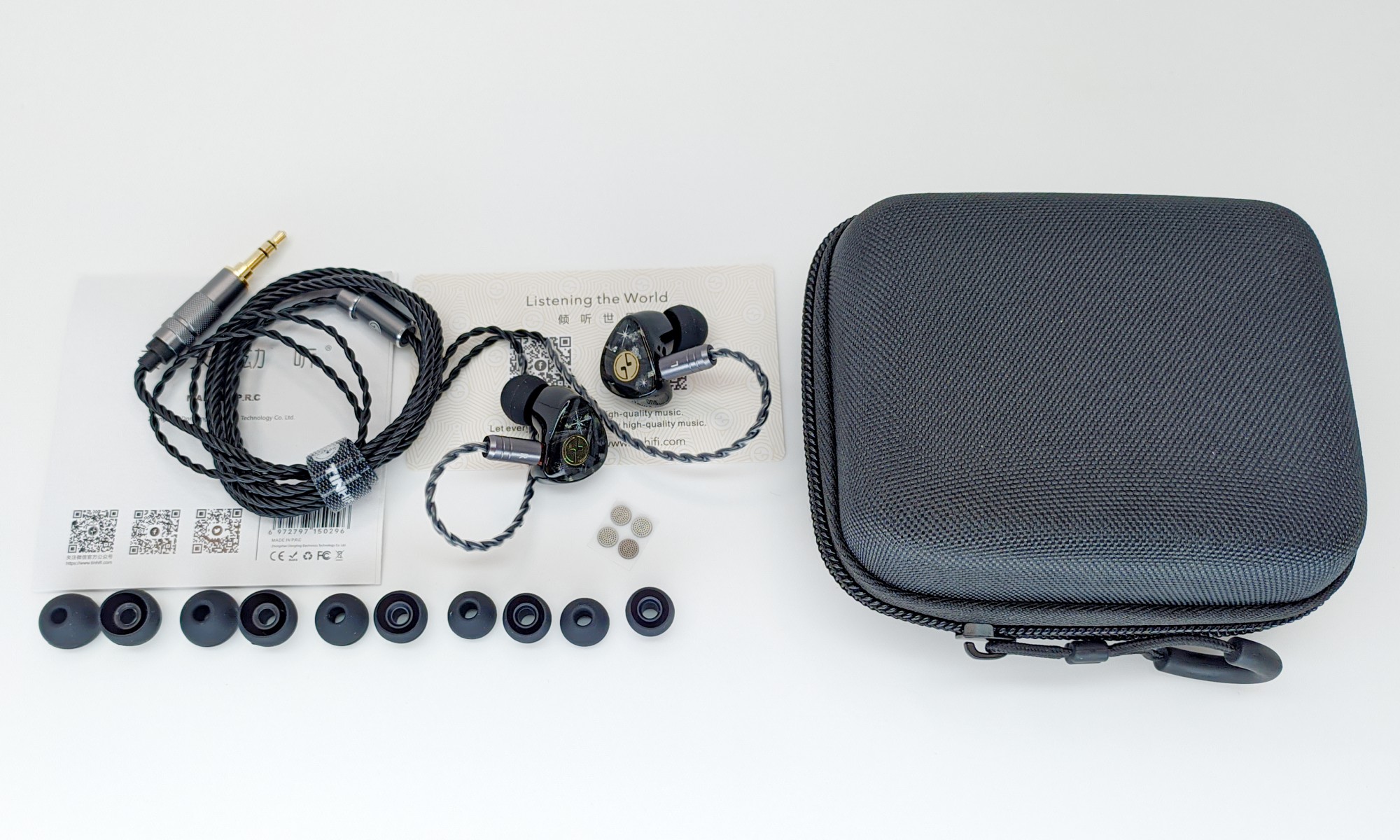 Кроме этого, нам положили два набора совершенно одинаковых силиконовых насадок размеров S/M/L, полноценную скрутку для кабеля с хлястиком фиксации на самом кабеле и два набора сменных сеток на звуководы. Последнее — это прям очень хорошо. Всем производителям взять бы это на вооружение. Для них это копейки, для нас большой плюс. Да и самому производителю за сеточки безусловно плюс в репутацию.