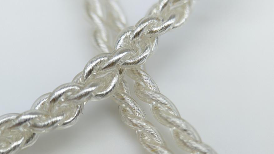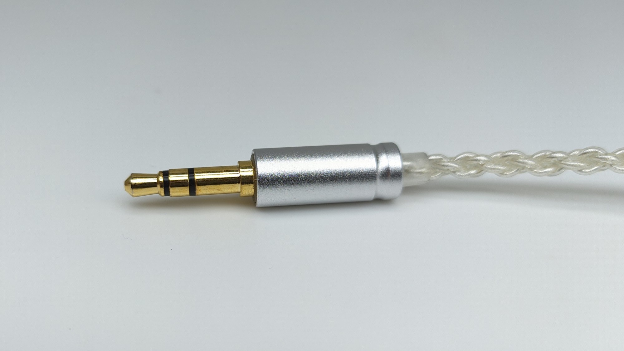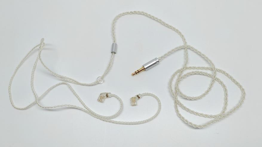 Комплектный четырехжильный медный кабель с посеребрением тонкий и эластичный, и поэтому склонен к запутыванию. У него есть бусина для регулировки разветвления, которая хорошо скользит и неплохо фиксируется. На корпусе джека 3,5 мм предусмотрена эластичная защита от перегибов.