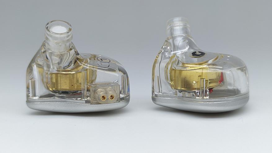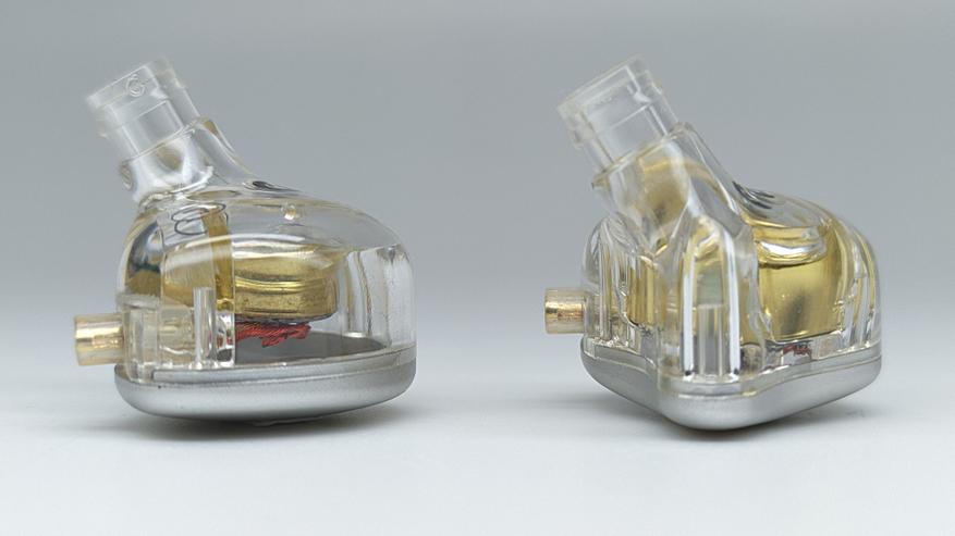 Пластиковые корпуса, пластиковые звуководы и фейсплейты из аэрокосмического алюминия с логотипом компании. Два компенсационных отверстия на внутренней части: одно для передней полости динамика, второе для тыльной акустической камеры наушников. QDC-разъемы для подключения кабеля. Габариты корпуса: длина — 23,3 мм, ширина (без учета QDC разъемов) — 17,7 мм, толщина — 13,3 мм, высота вместе со звуководами — 21,4 мм. Толщина звуковода на бортике для удержания амбушюр — 5,5 мм. Каждый наушник весит 4,8 гр. За звук отвечает 10-миллиметровый динамический драйвер с композитной мембраной DLC и двойной магнитной схемой.