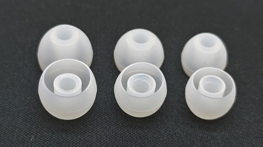 Наушники удобные, с комплектными насадками мне садятся хорошо. Сами насадки классической формы, с удлиненной ножкой, поэтому наушники могут чуть торчать из ушей в зависимости от используемого размера насадок. В комплект их положили стандартный набор из трех размеров. Какие-нибудь из них подойдут и вам. Корпуса у наушников получились небольшие, легкие и комфортные. На длинных дистанциях дискомфорт не выявлен. Зато выявлен небольшой драйвер-флекс (кликанье мембраны при надевании и поправлении наушников). При заклеивании скотчем компенсационного отверстия это выражено значительно сильнее из-за вакуумного эффекта.