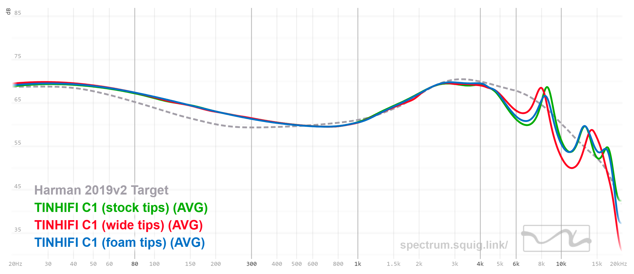 С измерительным микрофоном показывают C1 небольшое изменение звука при смене насадок. В реальном использовании звучание может отличаться от замеров, а также стоит учесть, что всё это индивидуально. Кроме одной из пар комплектных насадок, я также использовал сторонние насадки с широкими звуководами и пенные насадки.