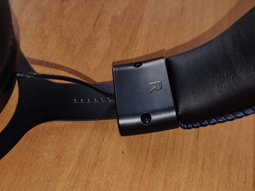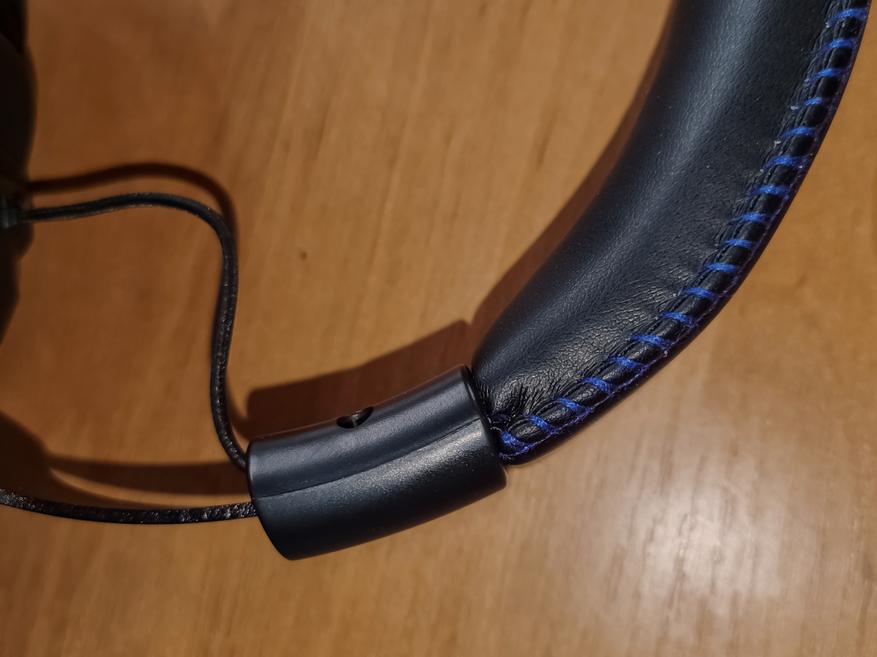Оголовье обшито кожзаменителем. Строчка ровная. Нить может быть синего или красного цвета. Внутренняя сторона оголовья мягкая (с поролоновым наполнителем). Каркас оголовья стальной (проверял магнитом), это должно положительно сказаться на живучести гарнитуры. Наушникине складываются. Для кого-то это может быть и минус, но я бы не назвал это серьезным недостатком. Складная конструкция для игровых наушников не является особо важной, но отсутствие дополнительных механизмов, так же способствует повышению надёжности.