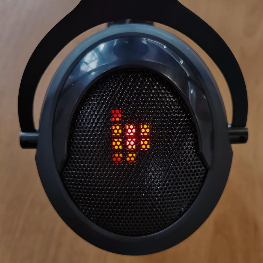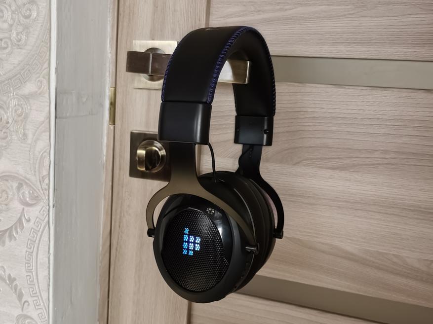 Чаши не поворачивается, но могут отклониться на 35 градусов. Держатели чаш металлические (судя по всему алюминиевые) и конечно же с регулировкой по вылету. Чашиимеют овальную форму. Внешнюю их сторону украшает декоративная металлическая решетка с серповидным козырьком (единственным глянцевым элементом в дизайне наушников). За решеткой скрывается RGB подсветка в форме логотипа производителя. Работает подсветка лишь при беспроводном подключении. Принудительно отключить подсветку нельзя.
