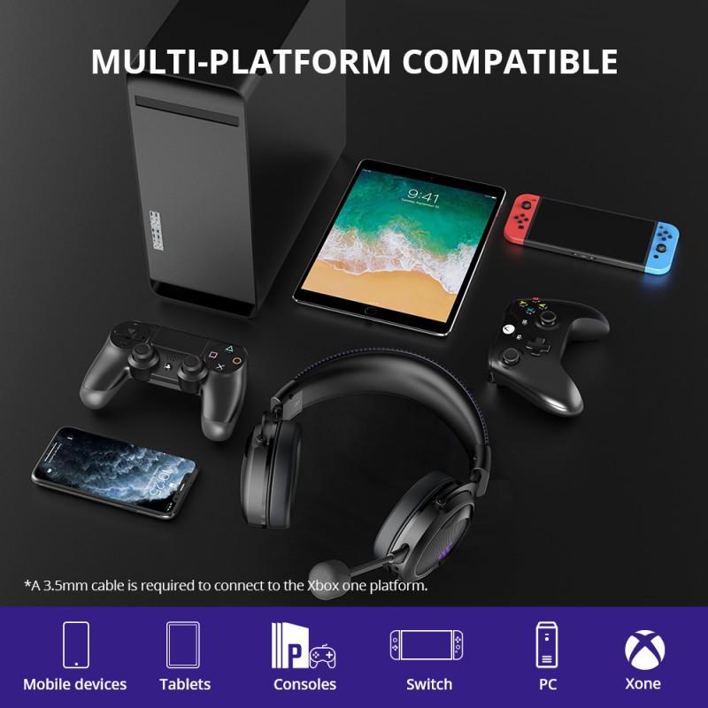 В комплектацию, помимо самих наушников, входят также: 1.2 метровый AUX кабель для передачи звука, USB/type-c кабель для зарядки наушников, гибкий съёмный микрофон, адаптер беспроводной связи 2.4 ГГц, инструкция и гарантийная карта.