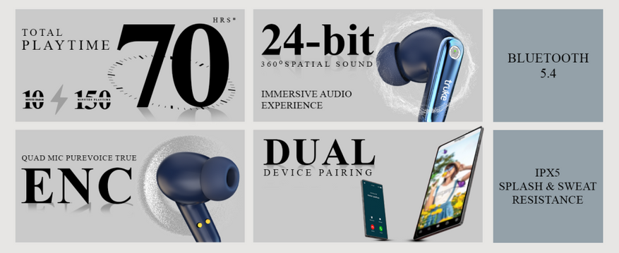 Новинка относится к внутриканальному типу наушников и оснащена 13-миллиметровыми титановыми драйверами, обеспечивающими воспроизведение 24-битного пространственного звука. Производитель интегрировал в устройство систему шумоподавления Quad Mic, которая улучшает качество голосовой связи при разговорах.
