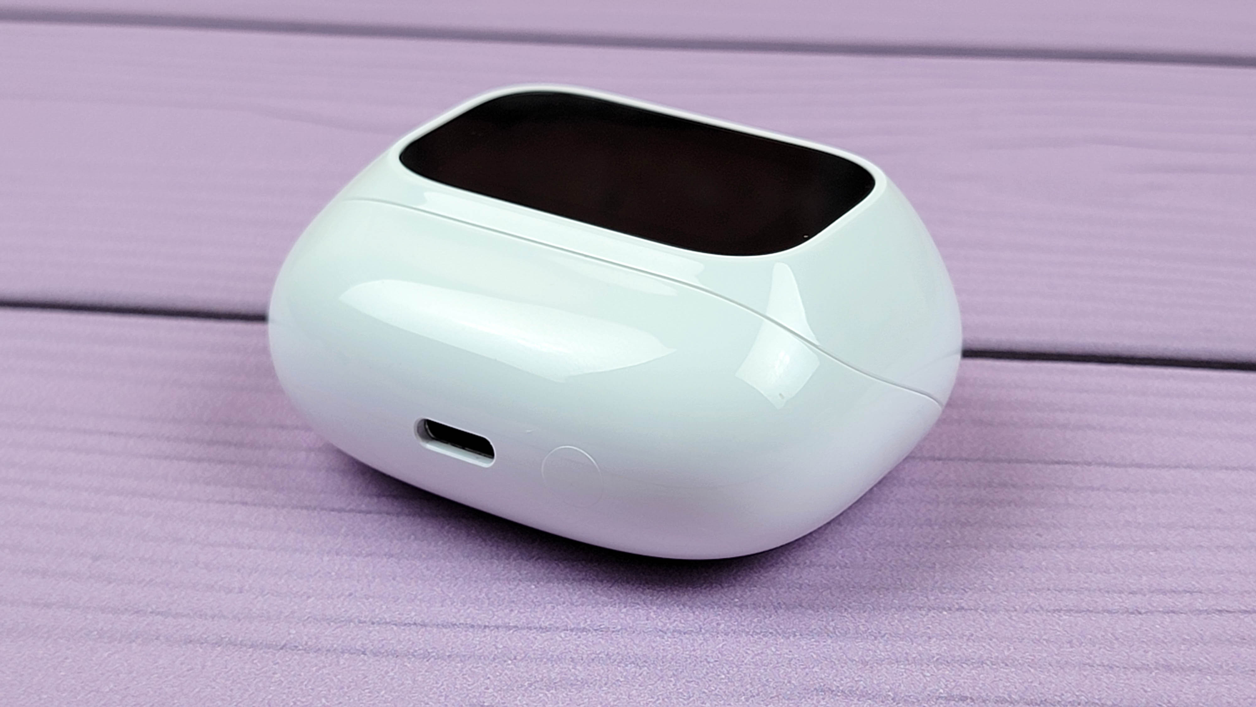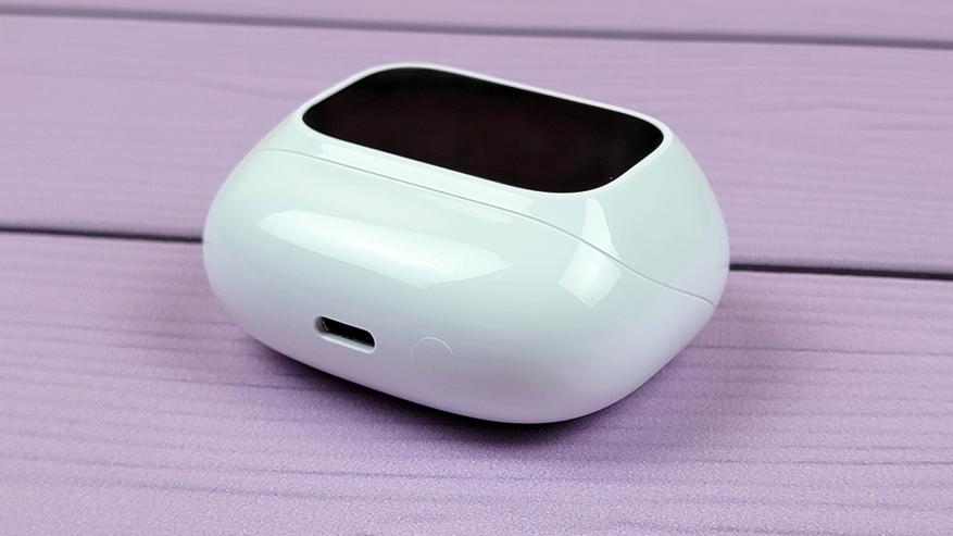 Заряжается кейс от USB-C, разъем разместили внизу. Справа от него физическая кнопка, которая используется для активации экрана (краткое нажатие) или сброса соединения наушников (зажать и держать несколько секунд).