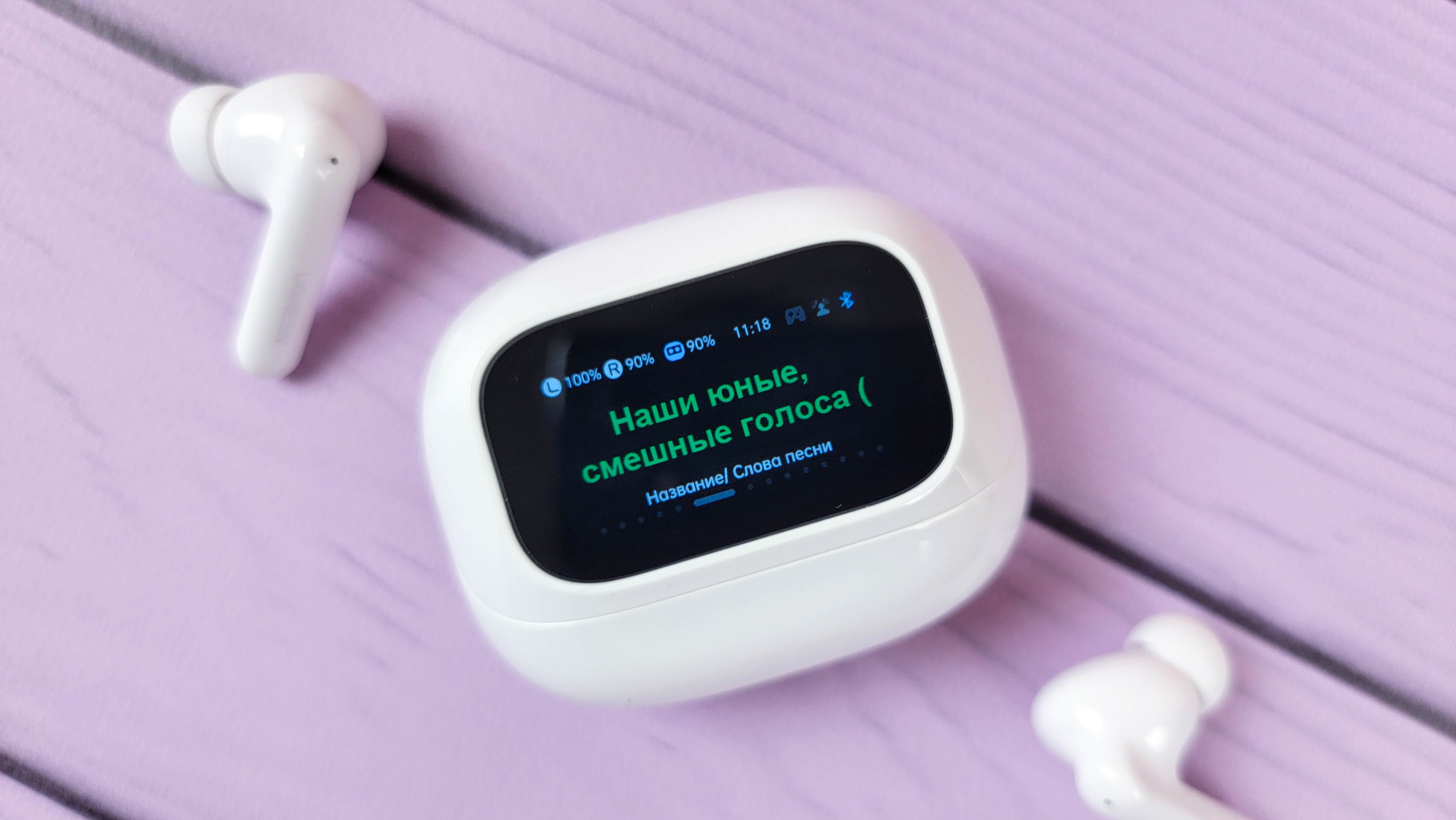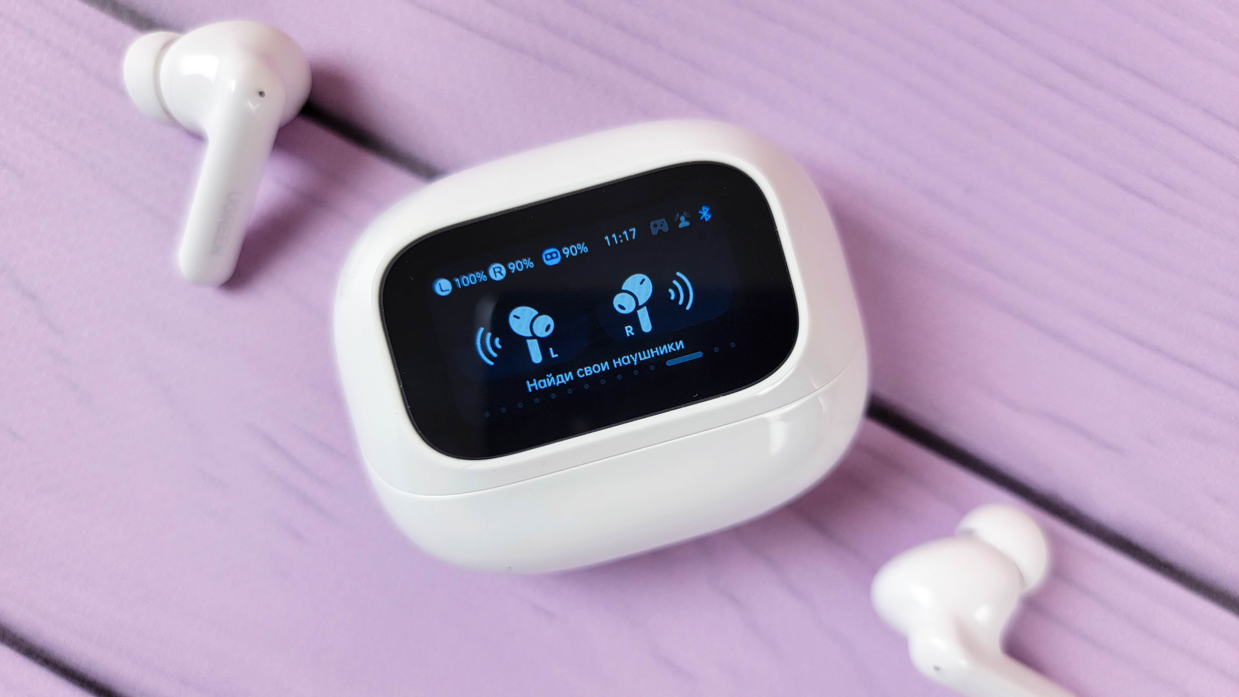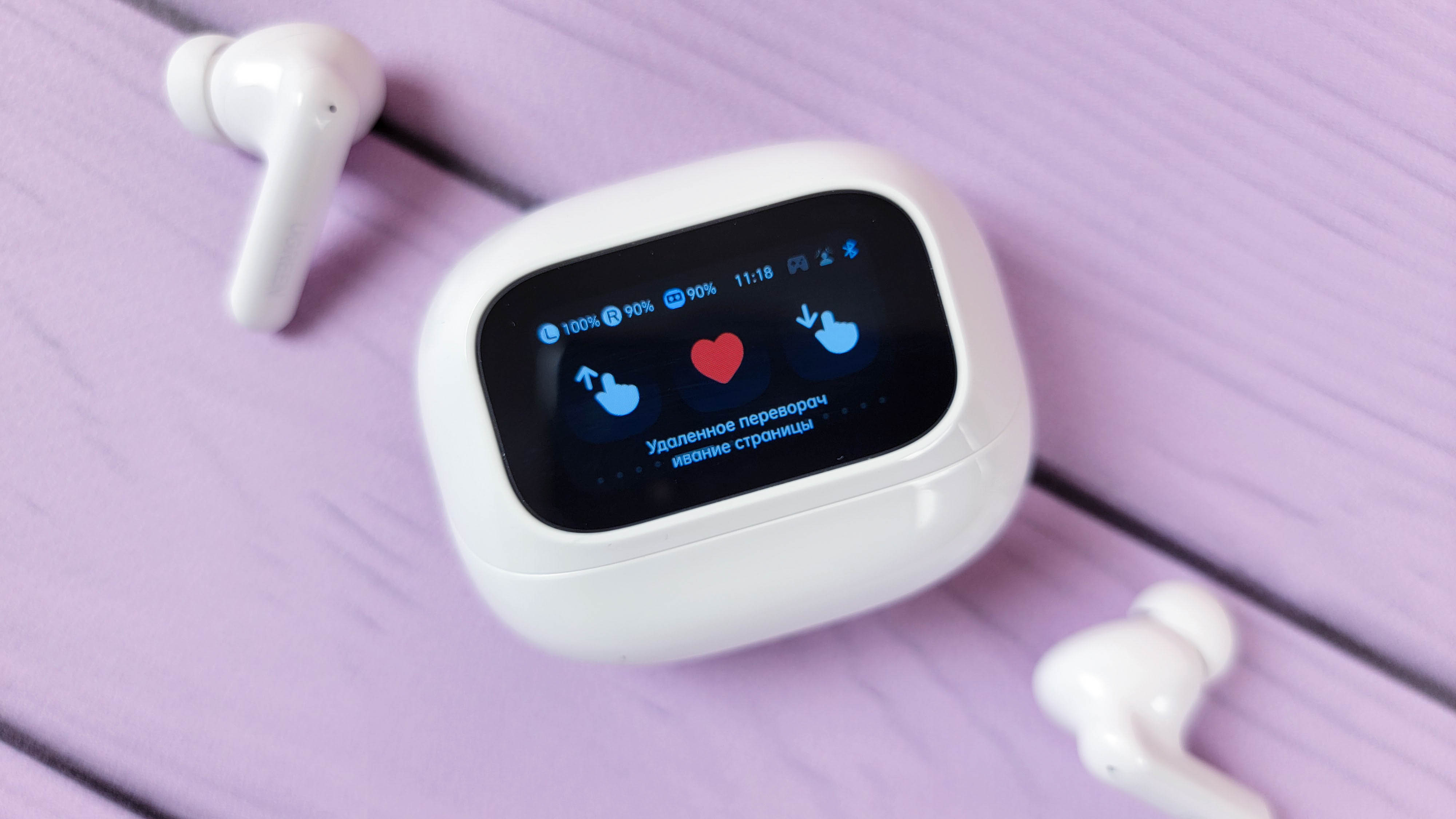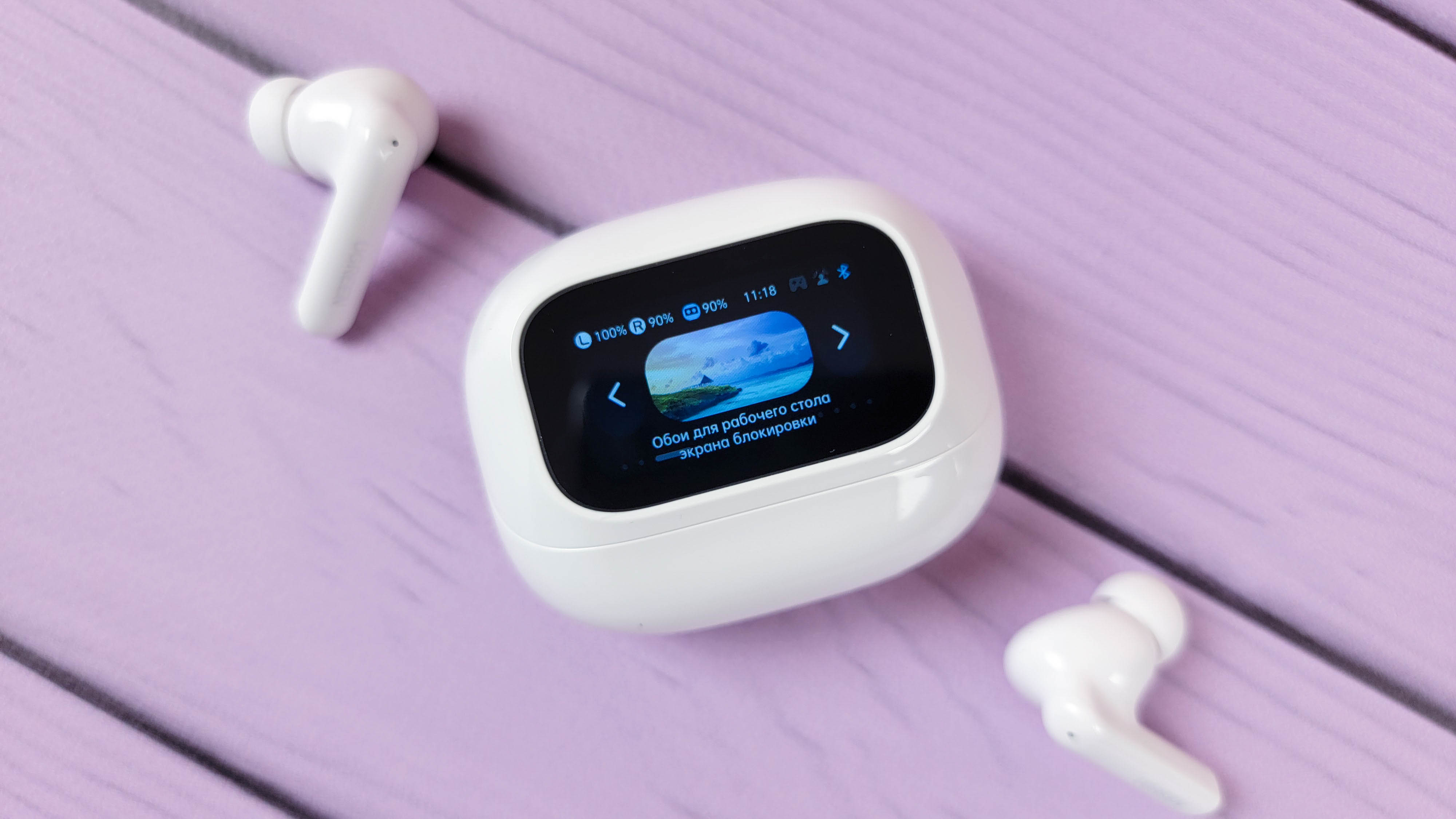Экран встроен в откидную часть и включается автоматически при открытии\закрытии. Также можно включить экран нажатием кнопки. В остальном это обычный кейс, где хранятся и подзаряжаются наушники. Сидят надежно, если потрясти не тарахтят.