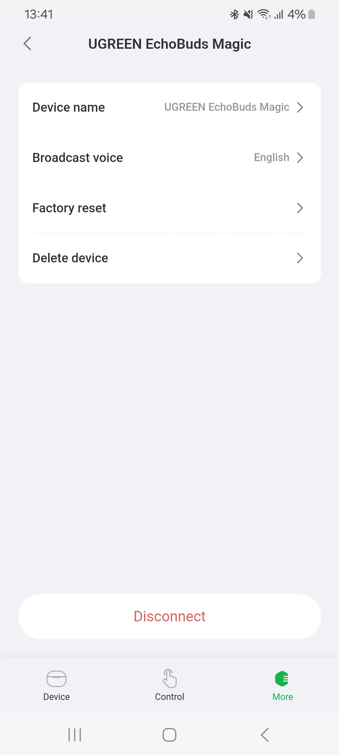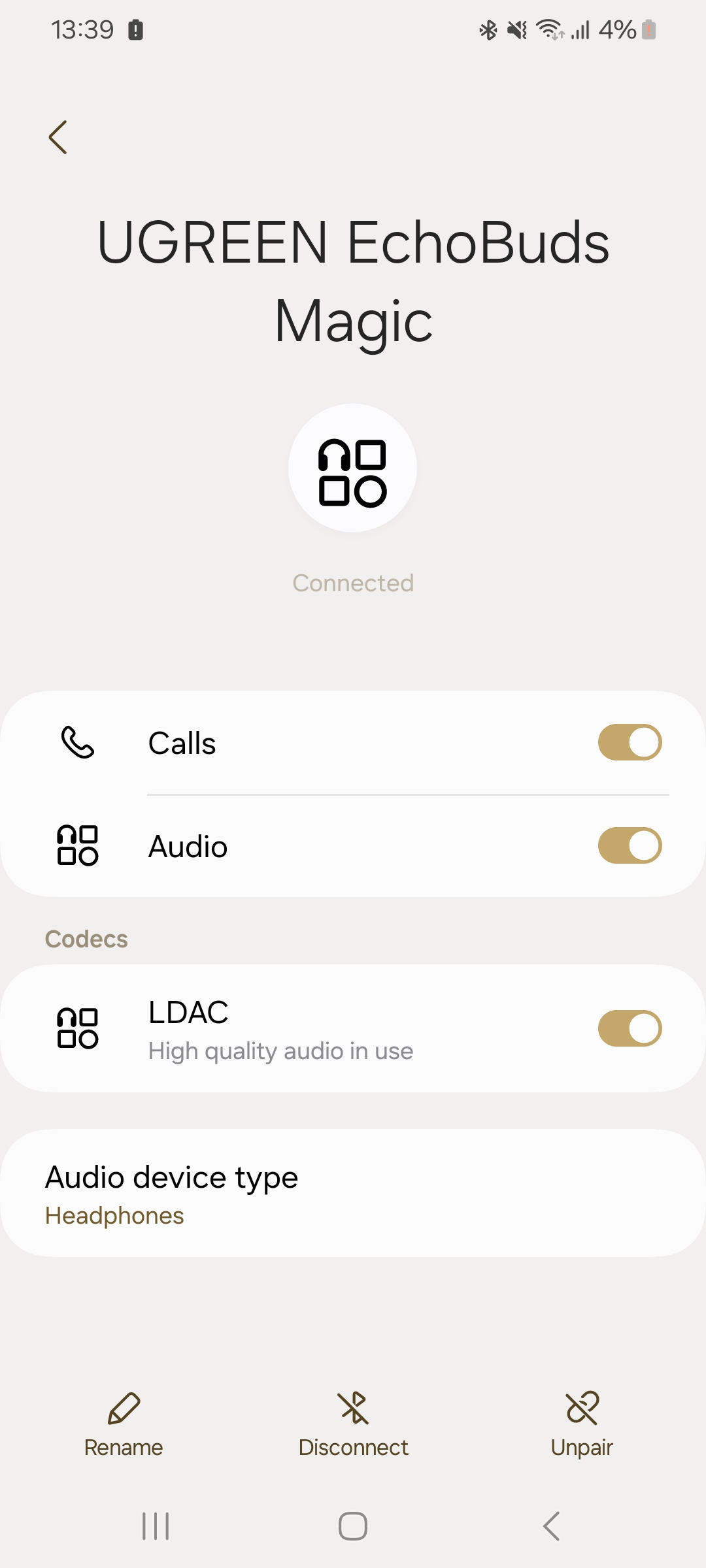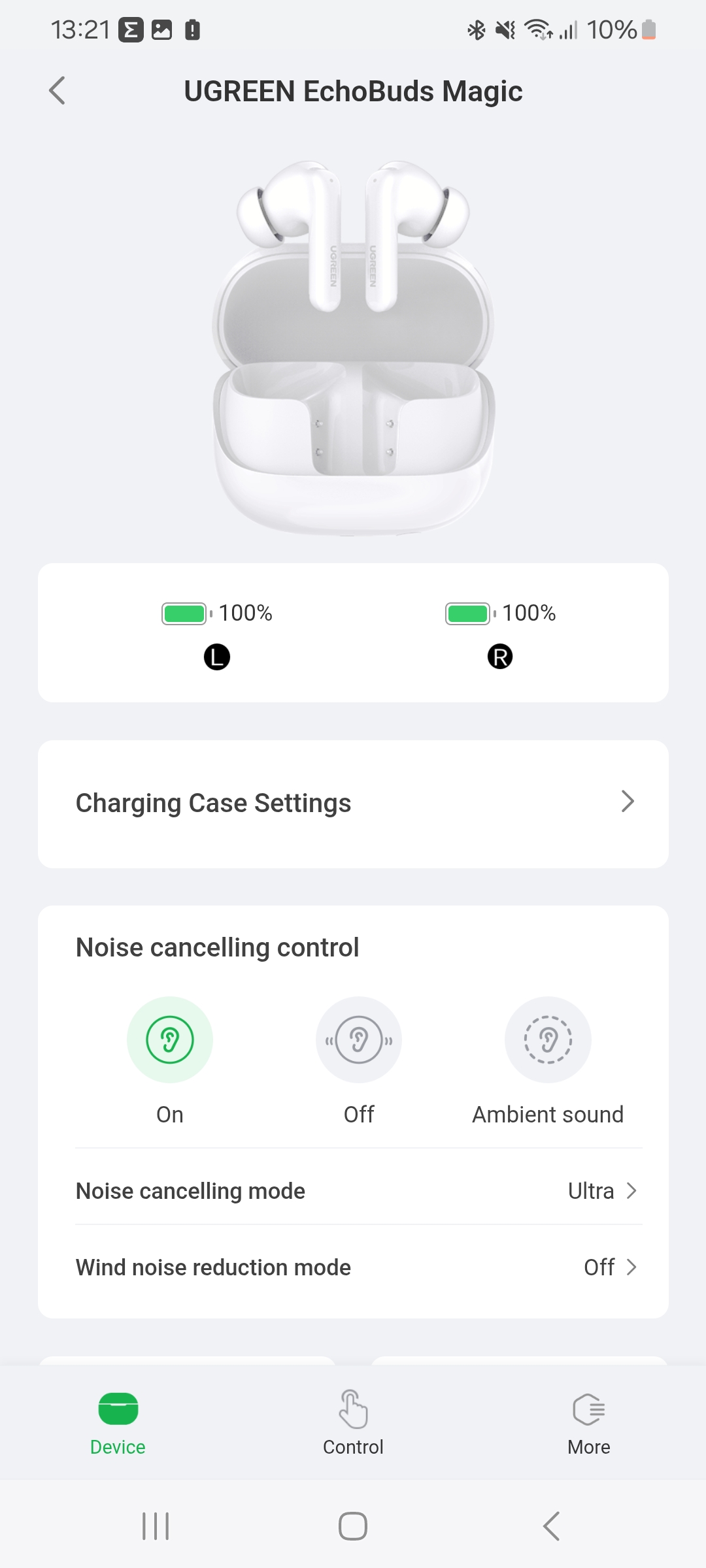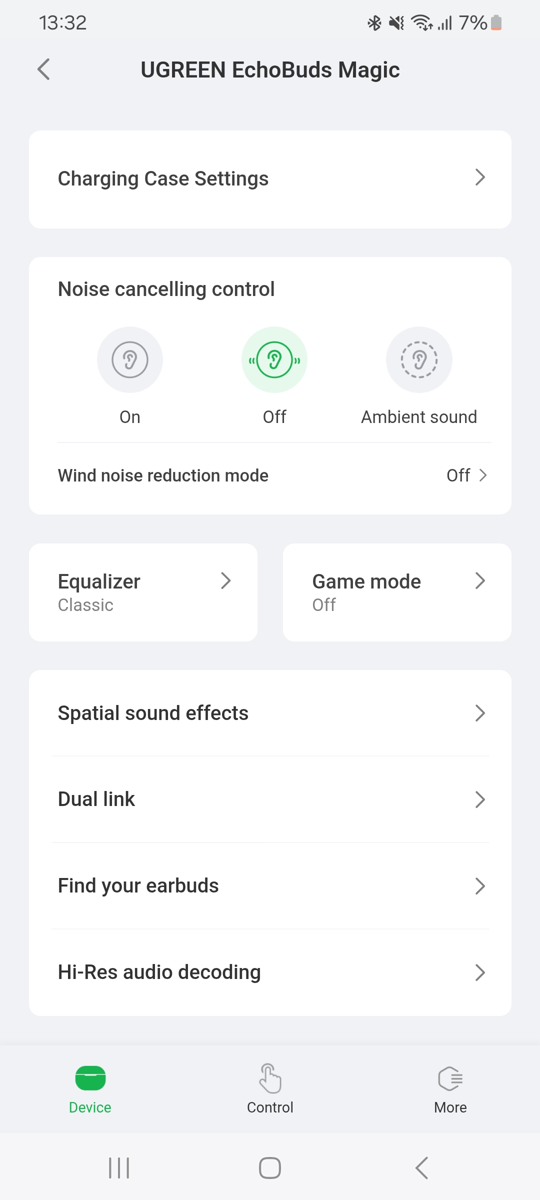 Теперь вкратце расскажу о приложении. Оно называется Ugreen Home и доступно для скачивания на официальном сайте Ugreen. После подключения, наушники автоматически определились в приложении, после чего сообщили о необходимости дать необходимые разрешения для использования некоторых функций удаленного управления. При запуске приложения открывается главный экран, который показывает статус подключения, уровень заряда и прочую информацию. Здесь мы можем переключать режимы и регулировать настройки.
