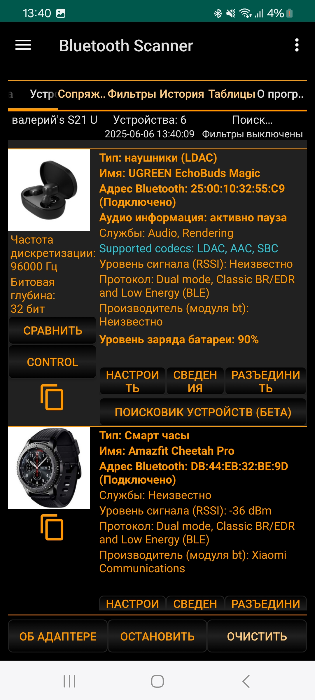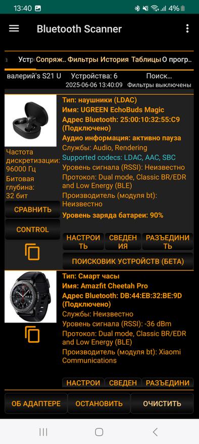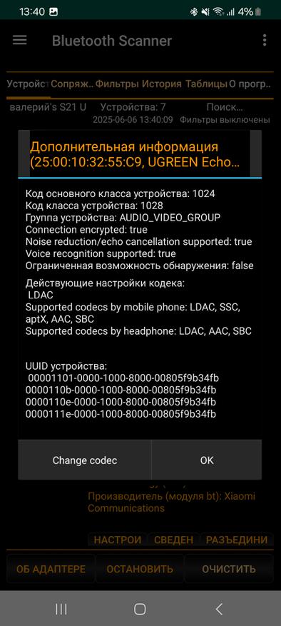 А вот информация из Bluetooth Scaner, где видно, что наушники действительно поддерживают кодеки SBC, AAC и LDAC, а подключение к смартфону Samsung Galaxy S21 Ultra осуществляется при помощи кодека LDAC. Единственный нюанс, в настройках подключения наушникам к смартфону нужно включить этот самый LDAC, т. к по умолчанию подключение идет через AAC. Хотя тут еще как посмотреть. Послушайте, сравните разницу. Возможны вы не услышите разницы между AAC и LDAC, тогда и смысла его включать нет (только автономность сократится).