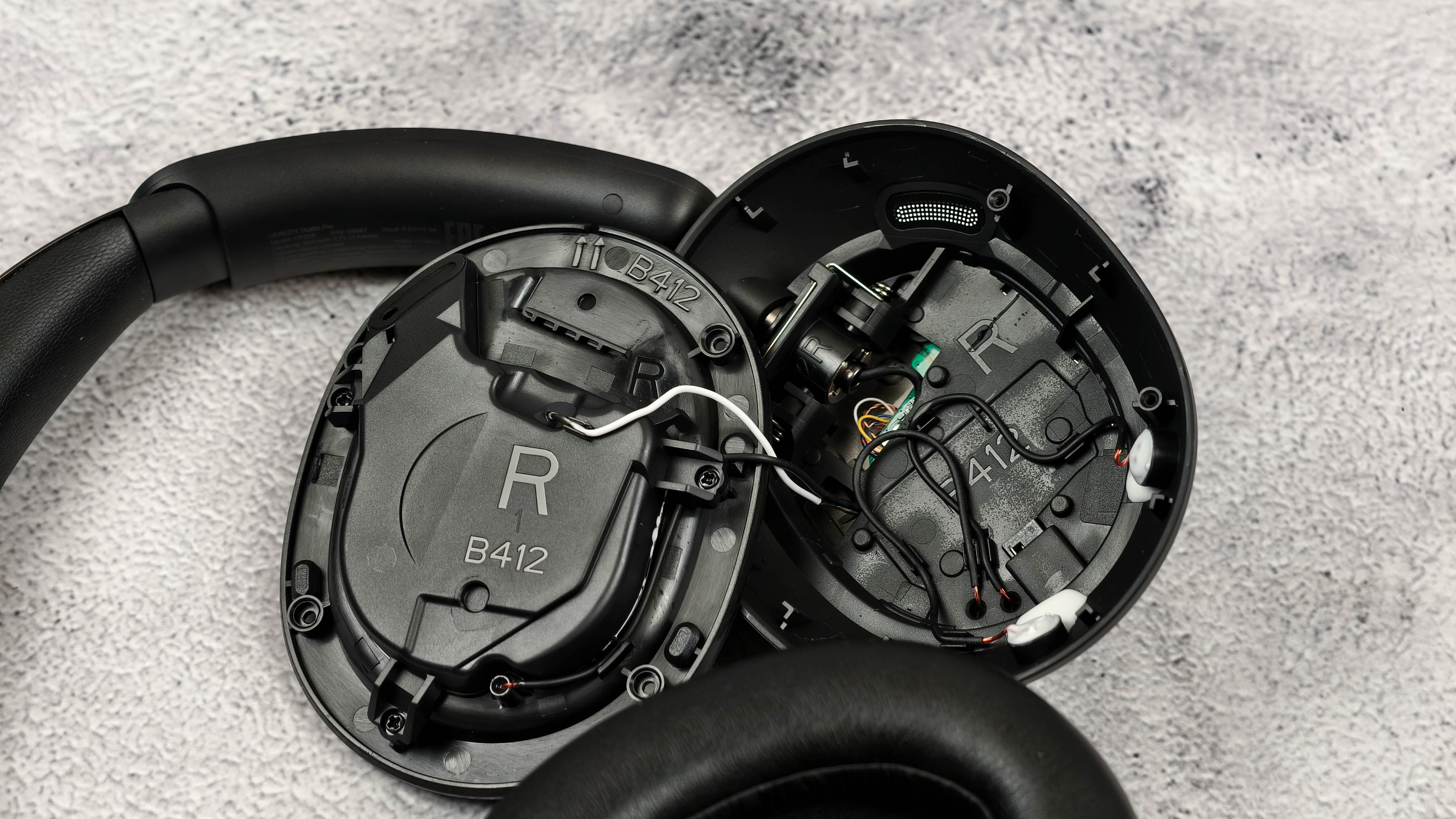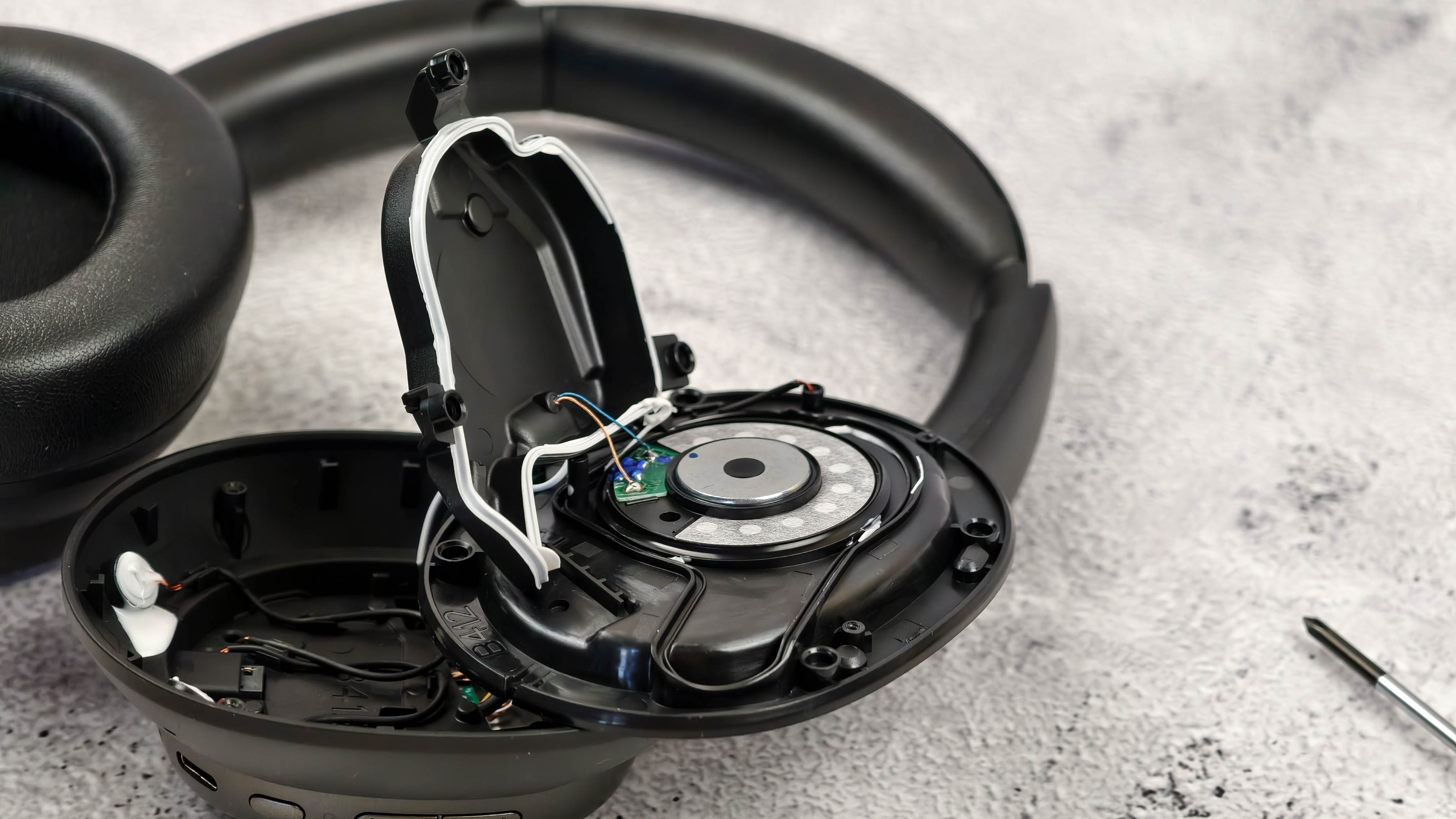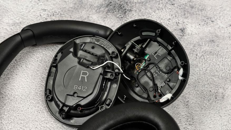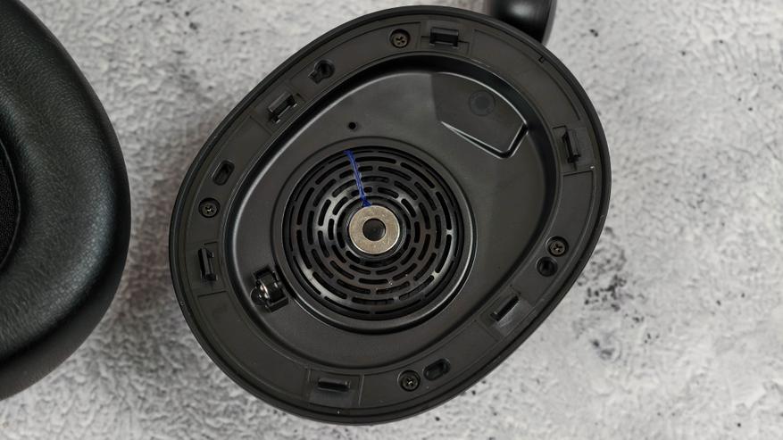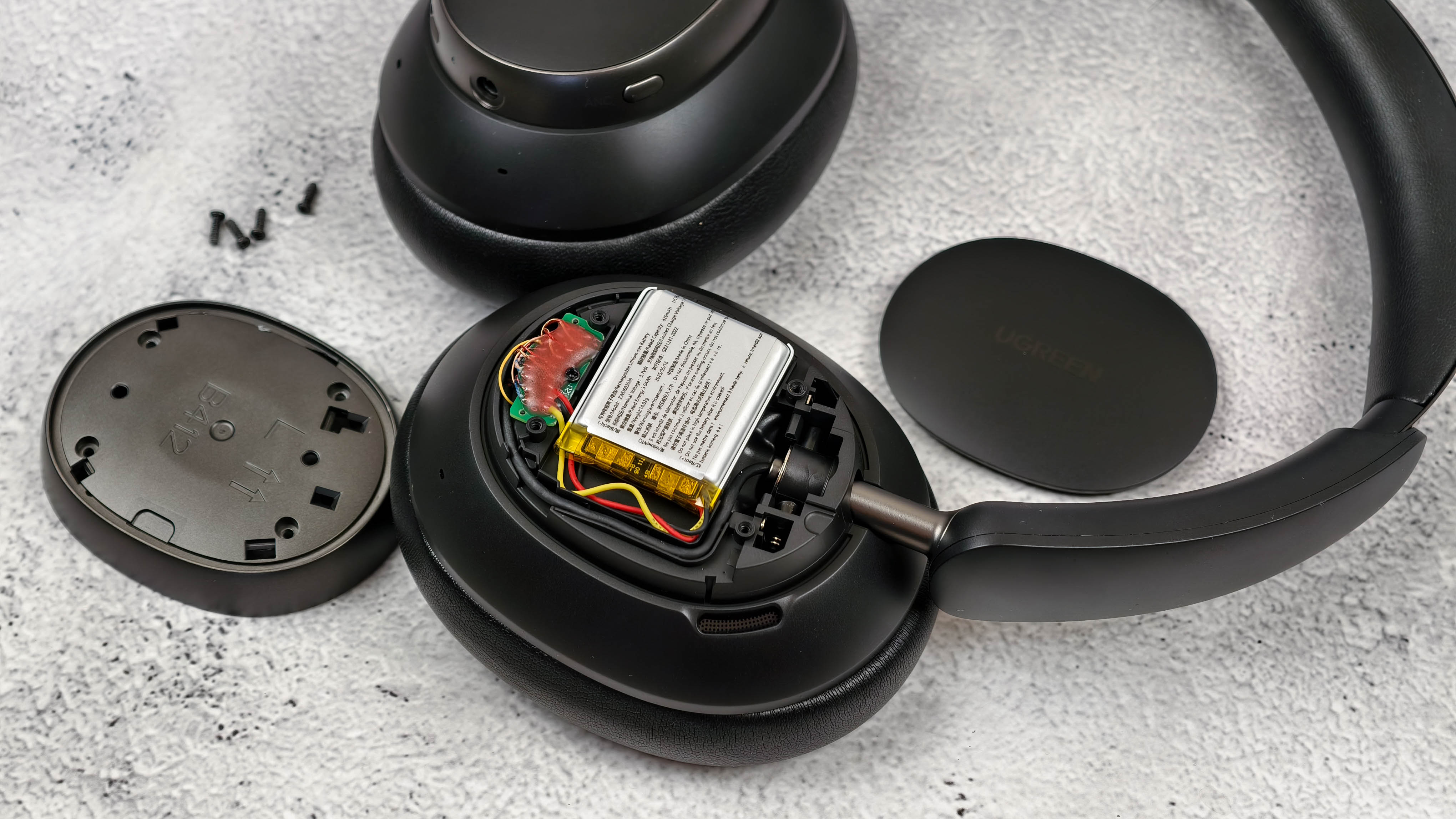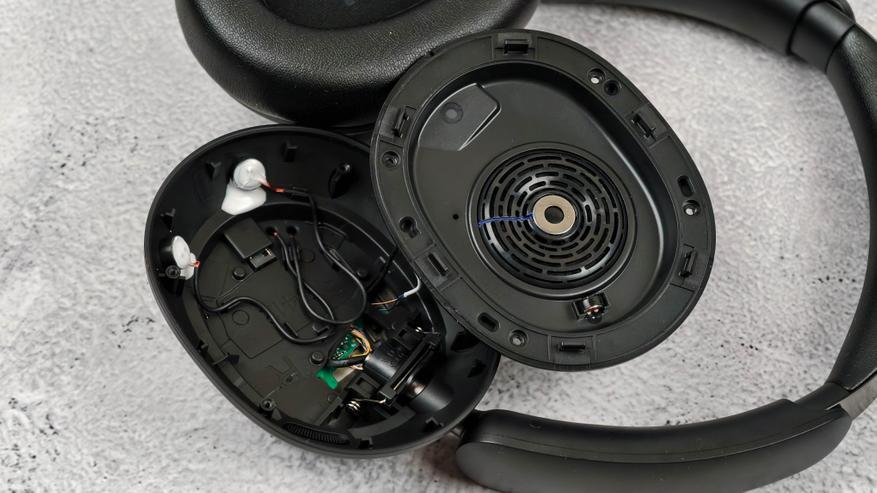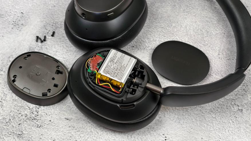 Плата управления размещается в правом наушнике, но добраться до нее мне не удалось. Для доступа к ней нужно разбирать с другой (внешней) стороны. Нужно снять заглушку на чаше (там где лого Ugreen), которая крепится защелками. Аккуратно это сделать не выйдет, поэтому я эту затею оставил.