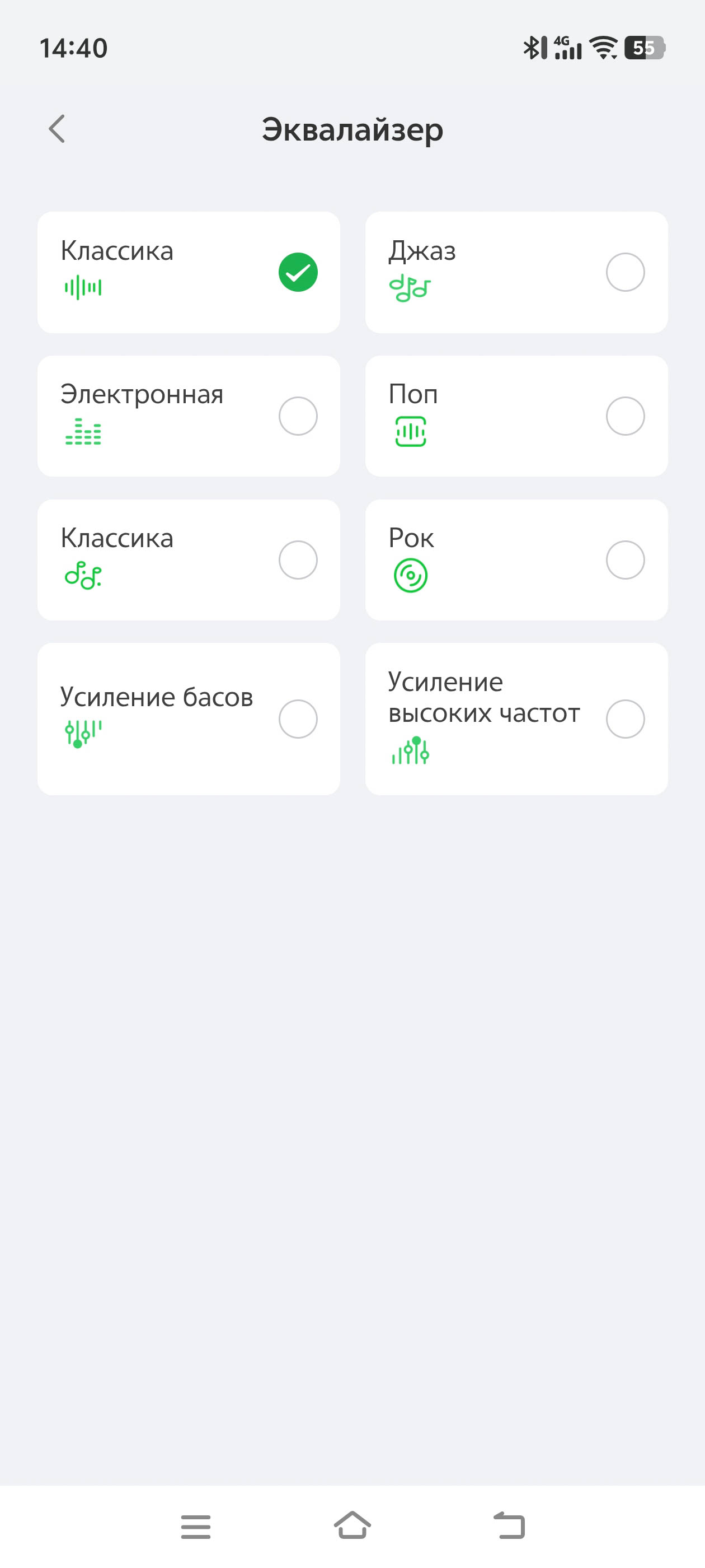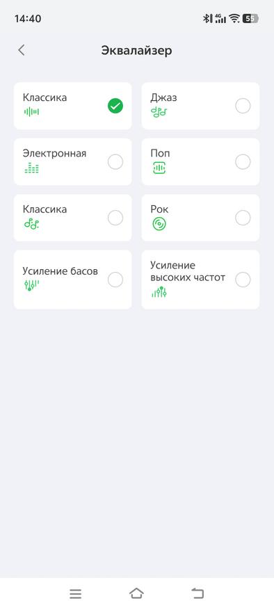 - Далее идет эквалайзер с 8 готовыми пресетами. Они довольно сильно меняют звучание, поэтому обязательно испробуйте их все. А вот ручных настроек по частотам нет, поэтому если хотите что-то точечно подкрутить, то нужно использовать плеер с встроенным эквалайзером, например, Musicolet.