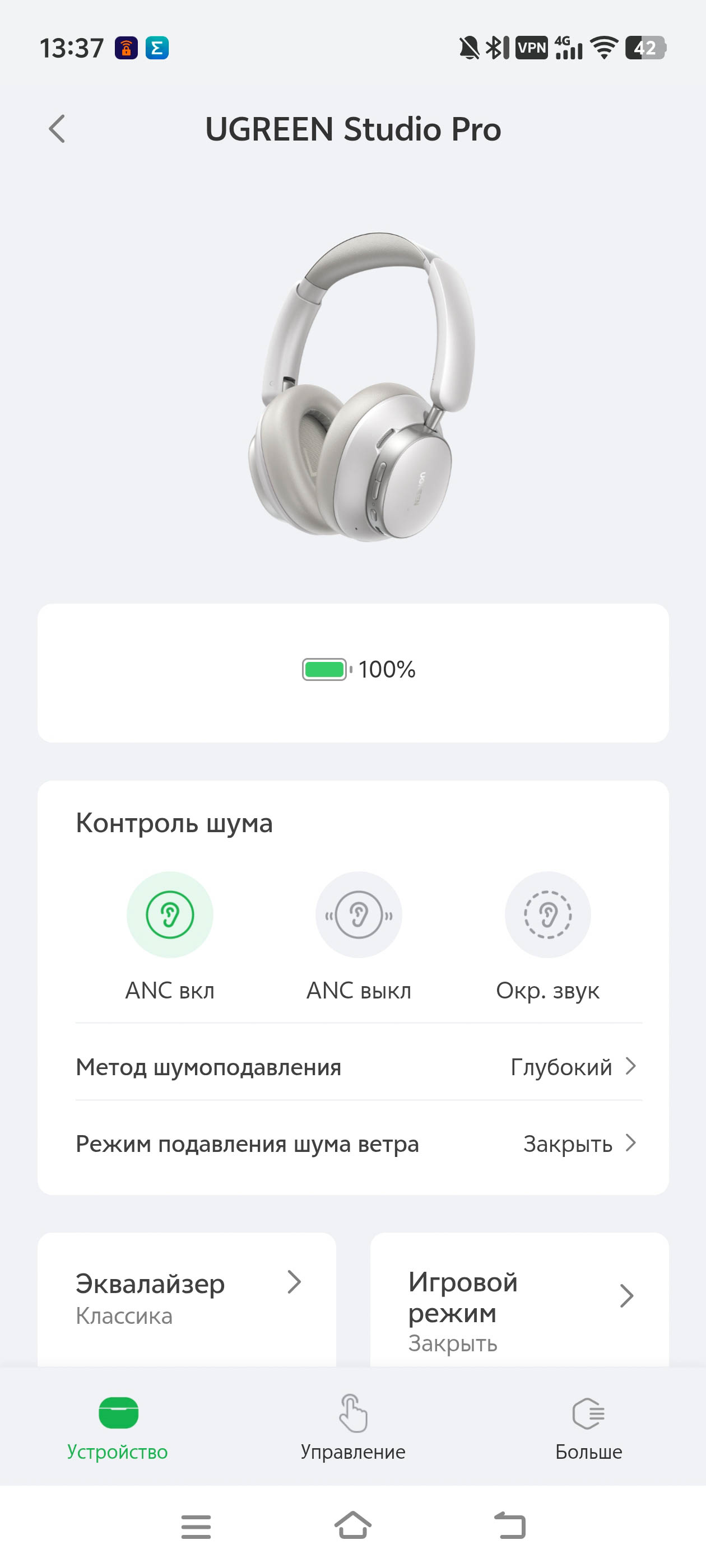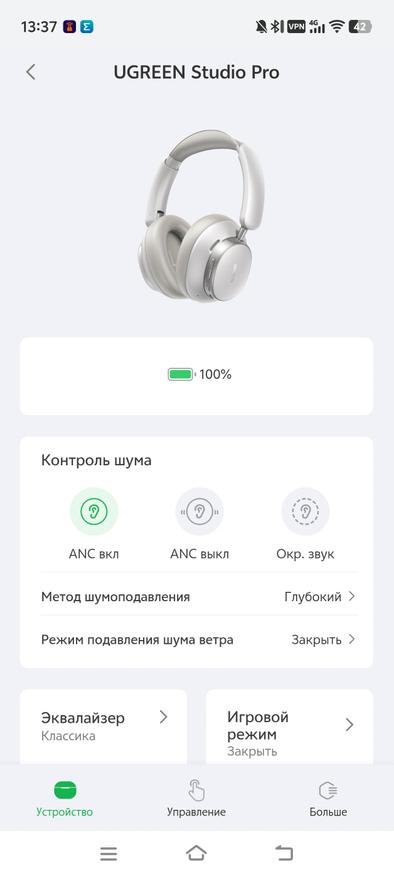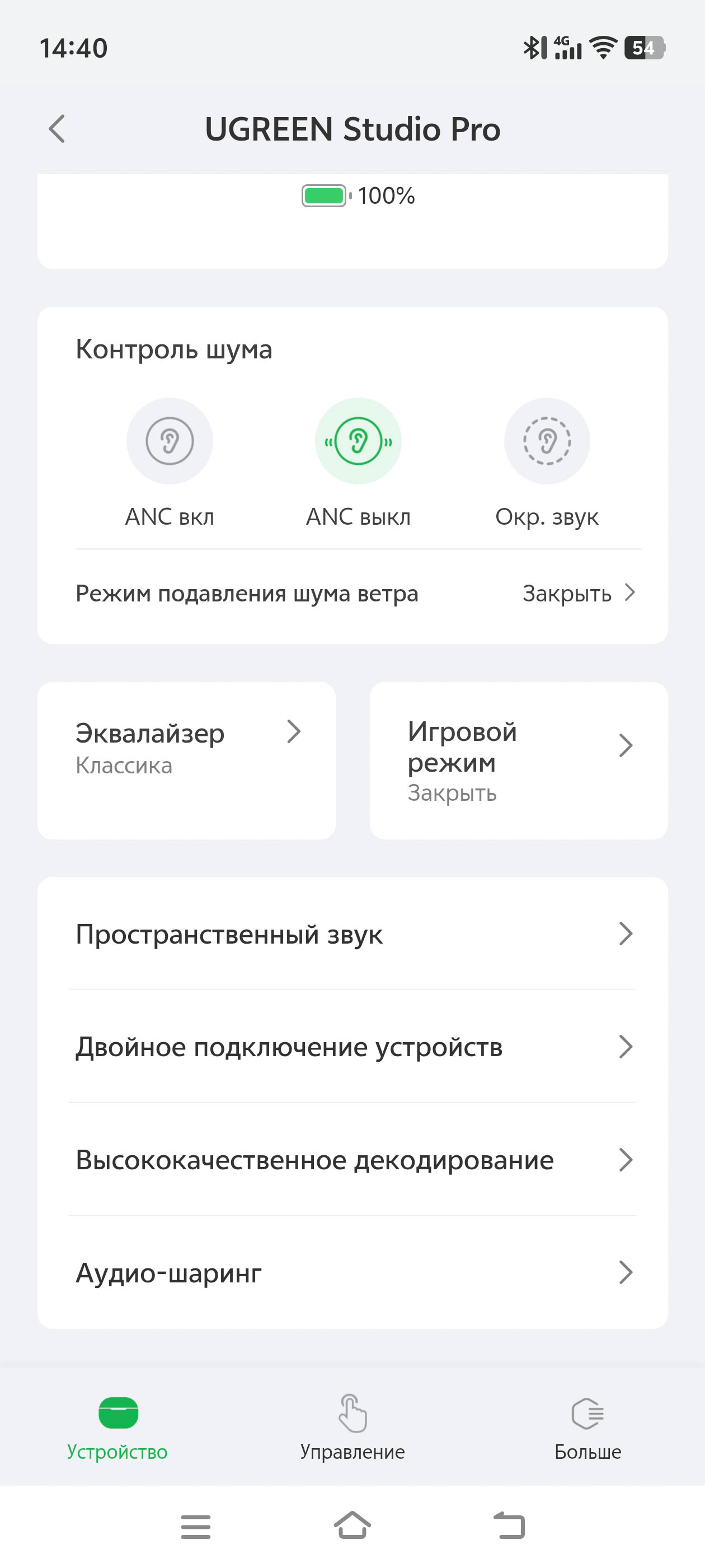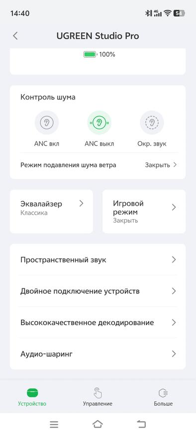 Заключительная часть обзора касается приложения Ugreen Home и других интересных возможностей наушников UGREEN Studio Pro. Подключение элементарное, наушники определились автоматически и подключились в один клик. На главной странице сразу выведены основные переключатели и первым идем шумподавления ANC. Помимо включения\отключения у вас есть возможность настроить его интенсивность, а также включить дополнительный режим ветроподавления. Есть адаптивный режим, в котором наушники сами выбирают степень шумоподавления, однако в моем случае оказалось, что они почти все время работают на максимуме. Я шумодав использую только в транспорте, поэтому проще оказалось включать вручную.