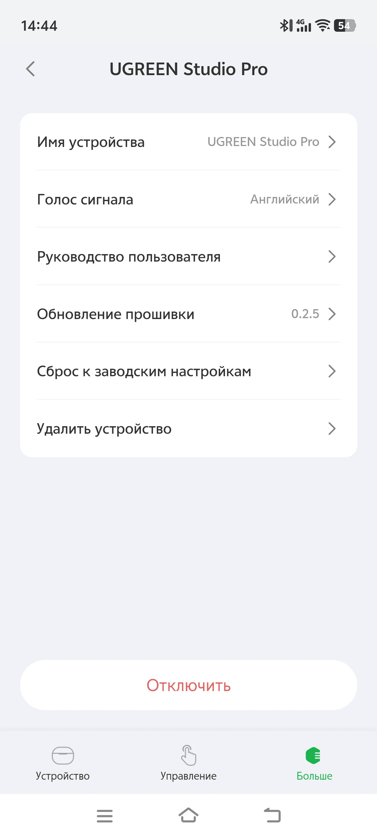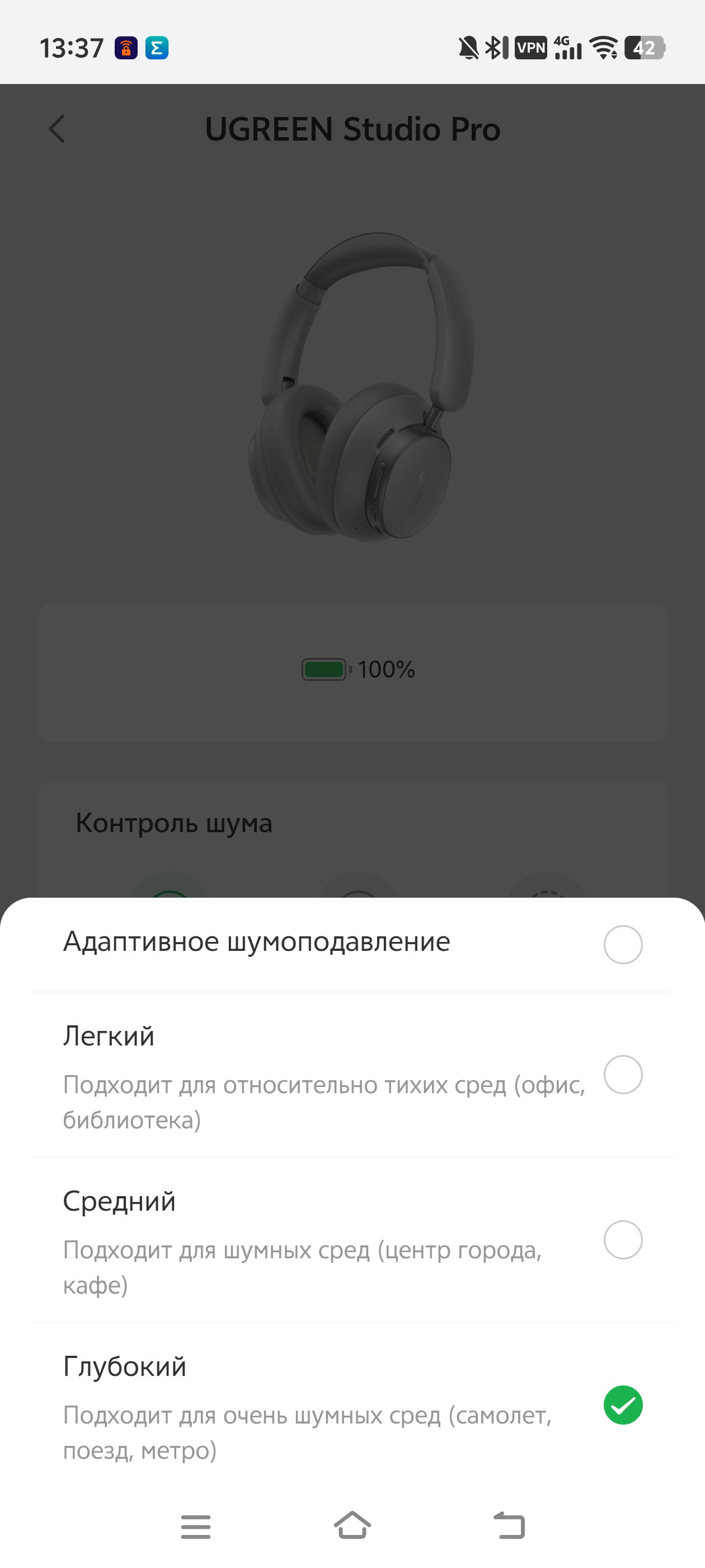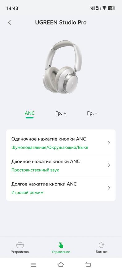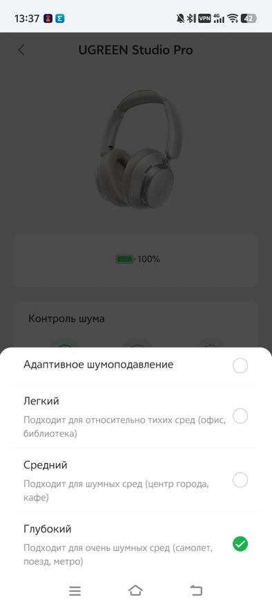 Заключительная часть обзора касается приложения Ugreen Home и других интересных возможностей наушников UGREEN Studio Pro. Подключение элементарное, наушники определились автоматически и подключились в один клик. На главной странице сразу выведены основные переключатели и первым идем шумподавления ANC. Помимо включения\отключения у вас есть возможность настроить его интенсивность, а также включить дополнительный режим ветроподавления. Есть адаптивный режим, в котором наушники сами выбирают степень шумоподавления, однако в моем случае оказалось, что они почти все время работают на максимуме. Я шумодав использую только в транспорте, поэтому проще оказалось включать вручную.