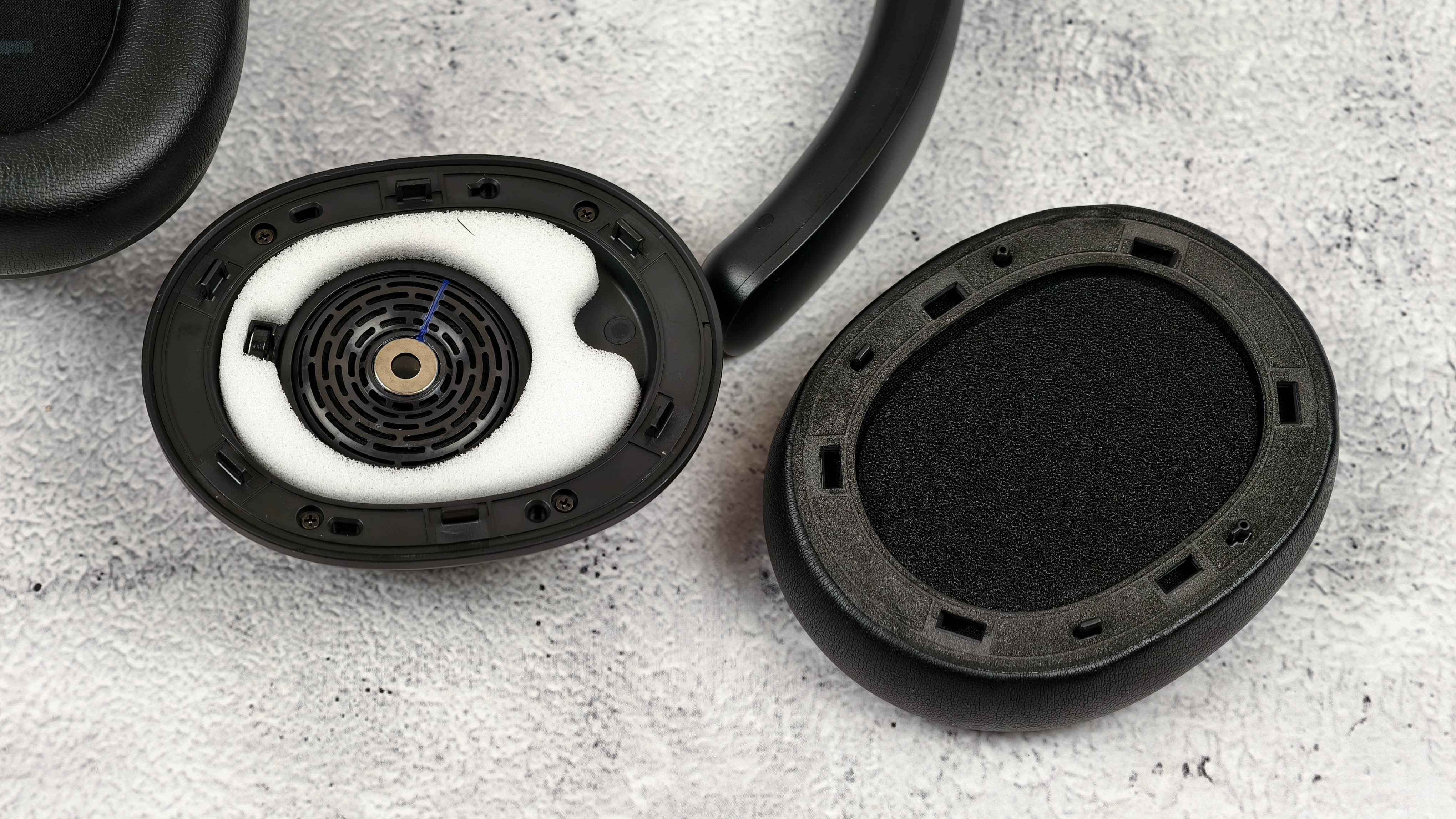 Ну, а теперь посмотрим, что внутри. Насадка с амбушюрами плотно посажена на пластиковые защелки и снимается весьма проблематично. Однако все же снимается и если нужно будет заменить амбушюры, то это возможно. Они являются с пластиковой накладкой единым целым и меняются соответственно в сборке (а тут уже вопрос к Ugreen, будут ли они их продавать). Между амбушюрами и динамиком есть различные поролоновые вставки, которые исключают паразитные отражения звука от корпуса.