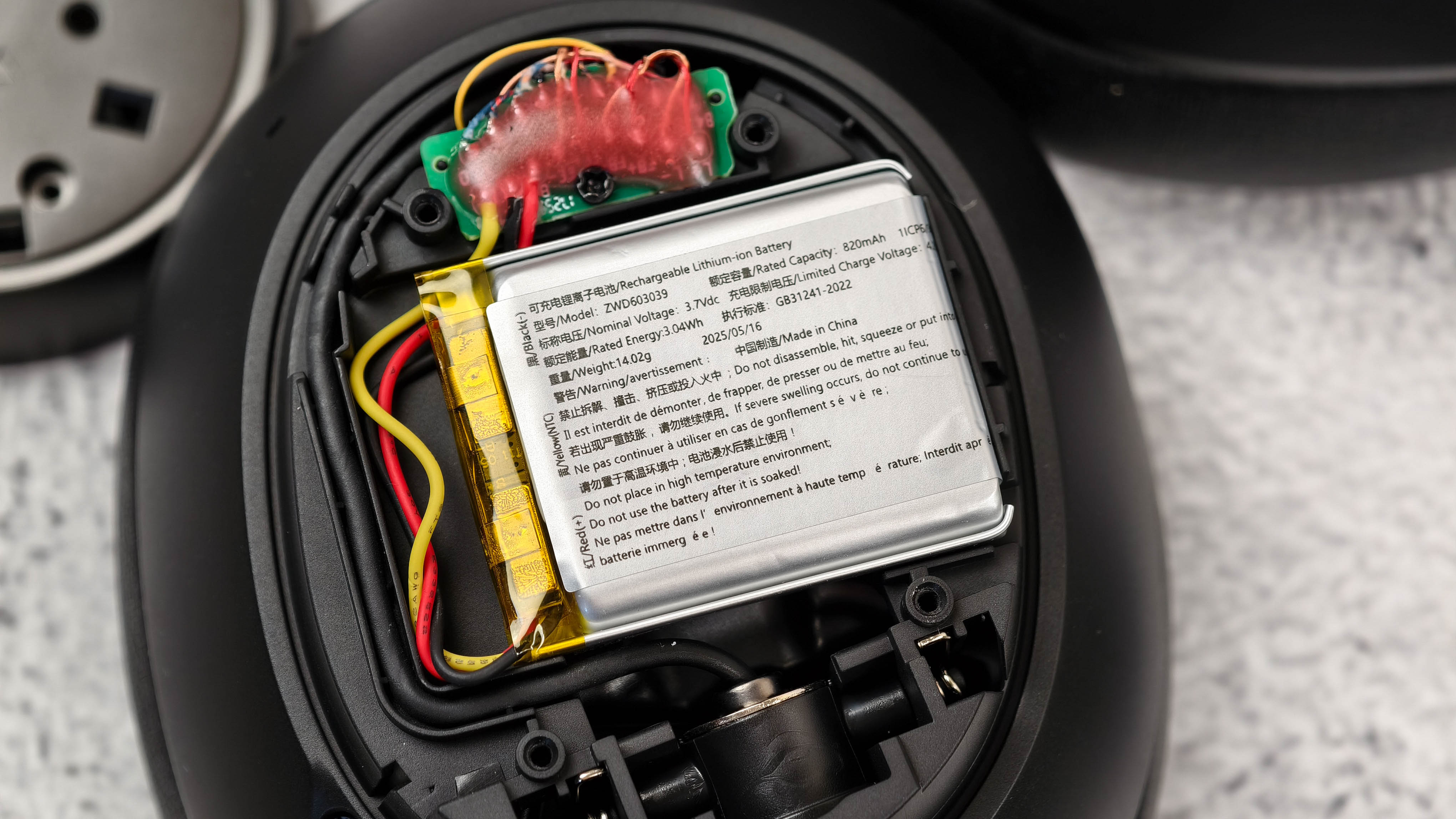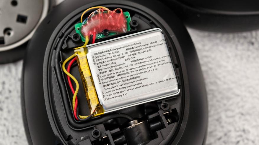 Собственно вот так выглядит аккумулятор. Маркировка: ZWD603039 — 820 mAh, 3.04 Wh. И здесь я пожалуй расскажу об автономности наушников. Производитель обещает 120 часов воспроизведения при использовании стандартного кодека AAC без использования шумоподавления. С шумодавом время воспроизведения составит около 80 часов. А если использовать LDAC, то будет еще меньше. А если еще и с шумодавом? Насколько меньше? Это я и решил проверить. Выбрал LDAC, громкость выставил на уровне 70%, шумодав включил на максимальную интенсивность и запустил воспроизведение. Наушники продержались 62 часа. Неплохо. Т. е в зависимости от громкости, кодека и частоты использования шумодава вы можете реально рассчитывать на время работы от 60 до 120 часов. А это означает, что заряжать вы будете их очень редко. Даже при регулярном использовании по несколько часов в день они продержутся несколько недель. А если вы используете их периодически, то будете заряжать их раз в несколько месяцев.