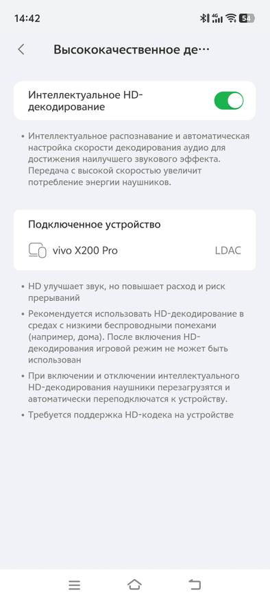 - HD-кодек LDAC (по умолчанию используется более простой AAC). При включении LDAC звучание становится заметно качественней, но при этом увеличивается расход аккумулятора. Также при использовании LDAC не доступен «игровой режим».