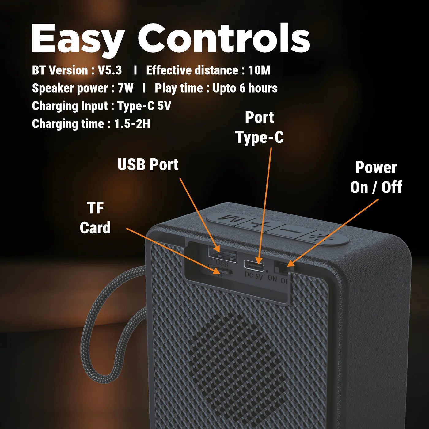 Колонка оснащена аккумулятором ёмкостью 1000 мАч, обеспечивающим до 6 часов воспроизведения, и поддерживает технологию TWS для синхронного подключения нескольких устройств. Зарядка через порт USB-C занимает 90-100 минут. Беспроводное соединение Bluetooth 5.3 работает в радиусе 10 метров, а дополнительные опции включают воспроизведение с TF-карт и USB-накопителей.