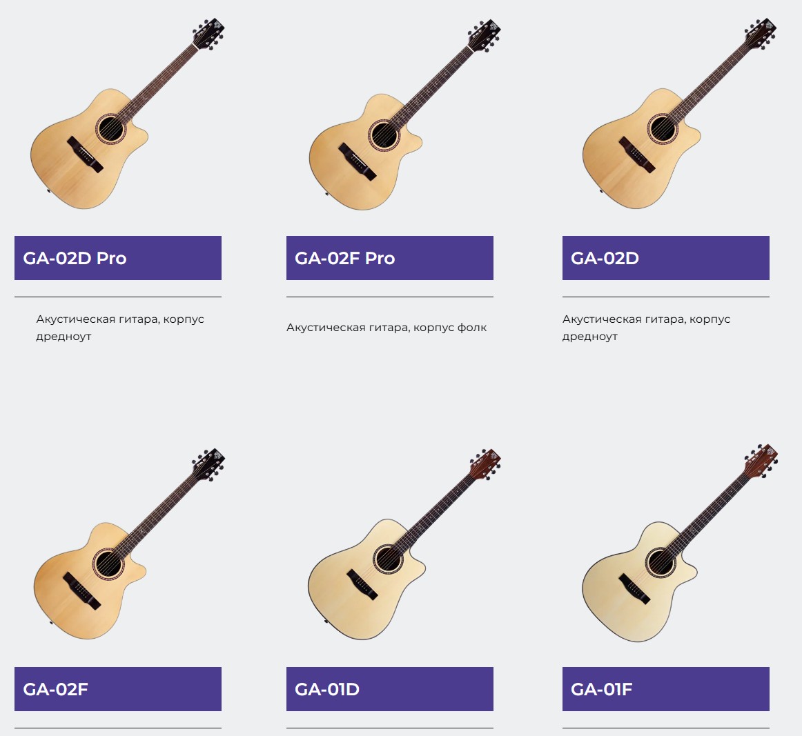 Речь идет про шесть моделей: GA-01D/GA-01F, GA-02D/GA-02F и GA-02D Pro/GA-02F Pro. Модели имеют различное оформление: Dreadnought с глубоким звучанием и облегченные Folk, которые удобно брать с собой.