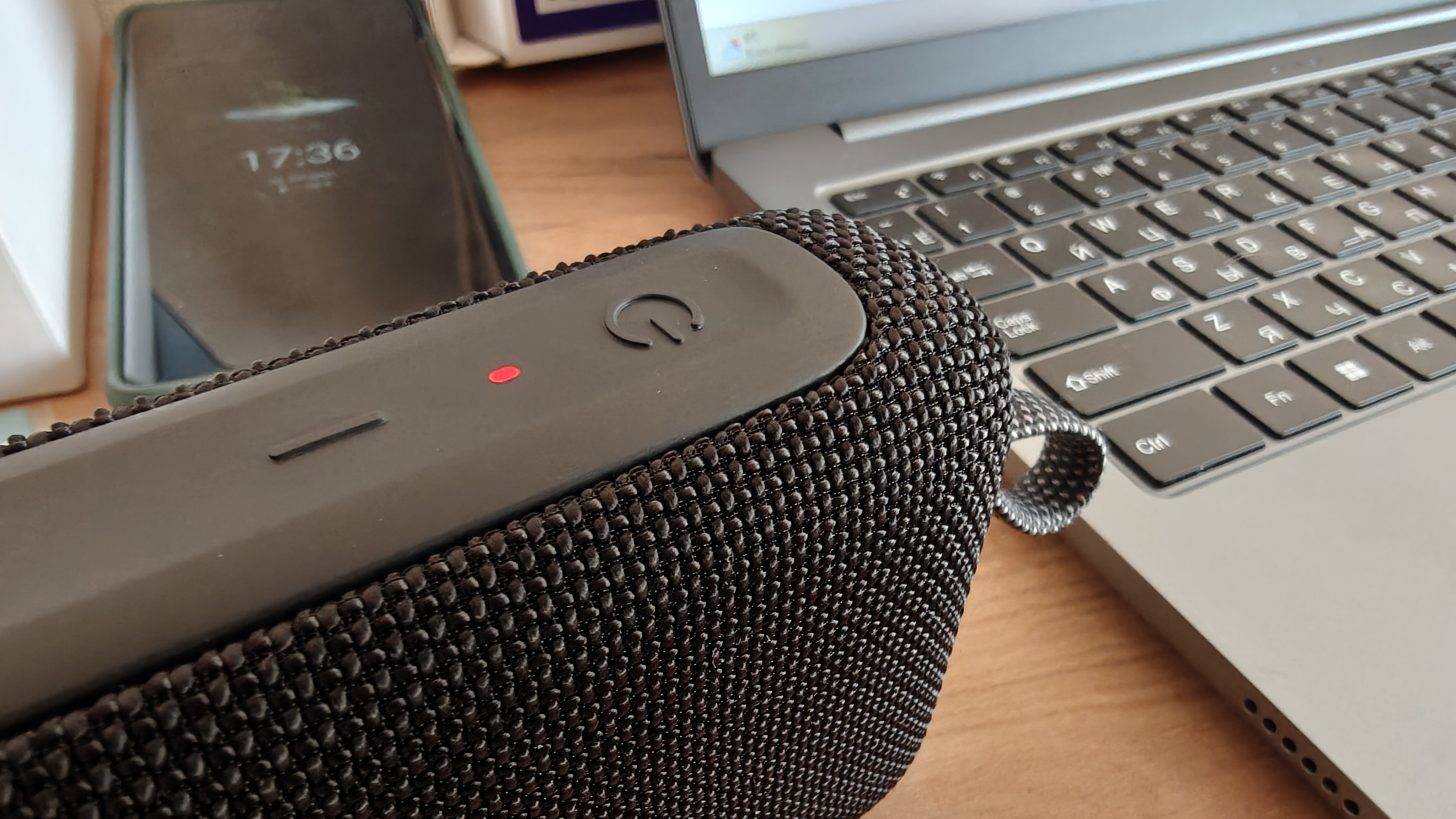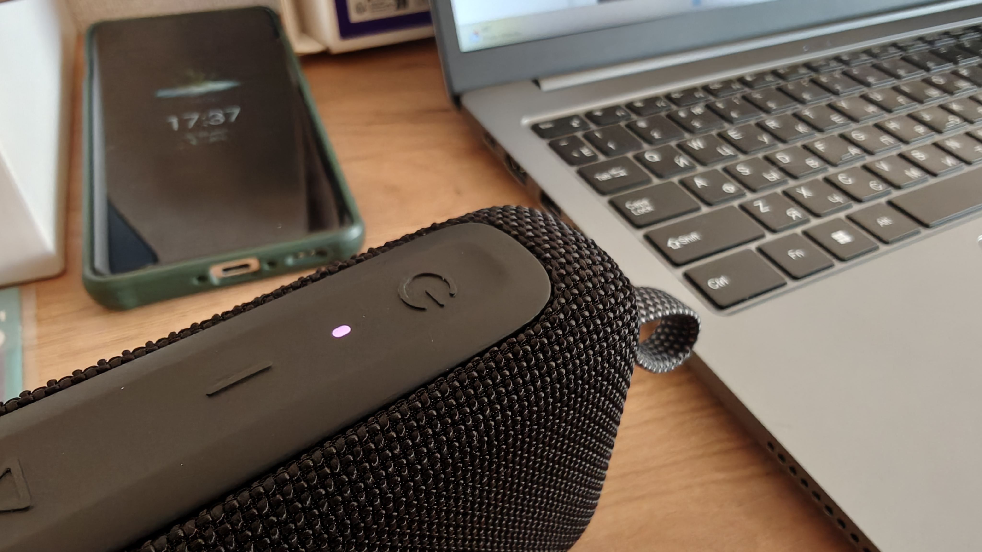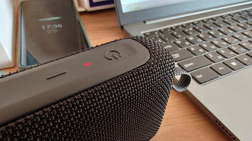 Для понимания статуса работы колонки используются индикаторы сверху. Если подключения по Bluetooth нет, синий индикатор моргает. Включенная колонка радует белым индикатором. Если происходит зарядка при выключенной колонке — индикатор красный, если колонка заряжается и используется одновременно — свет статусных индикаторов сливается и становится розовым.